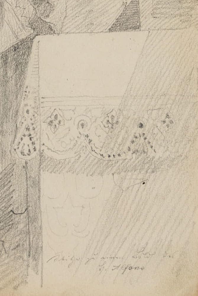 - Beschreibung: Mit feinen Schraffuren und Schattierungen gezeichneter Entwurf oder eine Figuren- und Kostümstudie für ein Historienbild im Stil der deutschen Spätromantik oder der Nazarener. Zeigt den am Altar in einer Kirche niederknienden Bischof Alfonso Maria de’ Liguori, der heiliggesprochen und zum Kirchenlehrer erhoben wurde. Das Blatt stammt aus einem Skizzenbuch eines anonymen Künstlers aus dem Umkreis des berühmten Historienmalers Moritz von Schwind (1804 Wien – 1871 Niederpöcking), der zu den bedeutendsten Malern der deutschen Spätromantik zählt. Wie im Werke Schwinds enthält das Skizzenbuch zahlreiche Darstellungen zu Historienszenen oder Illustrationen von Märchen- und Sagenstoff sowie religiösen Themen.