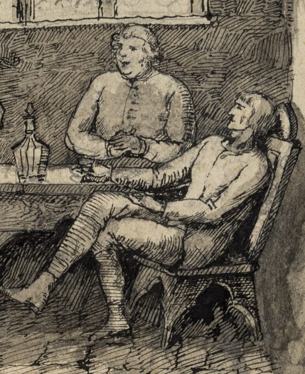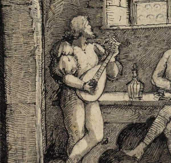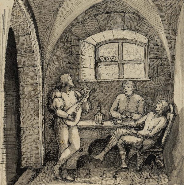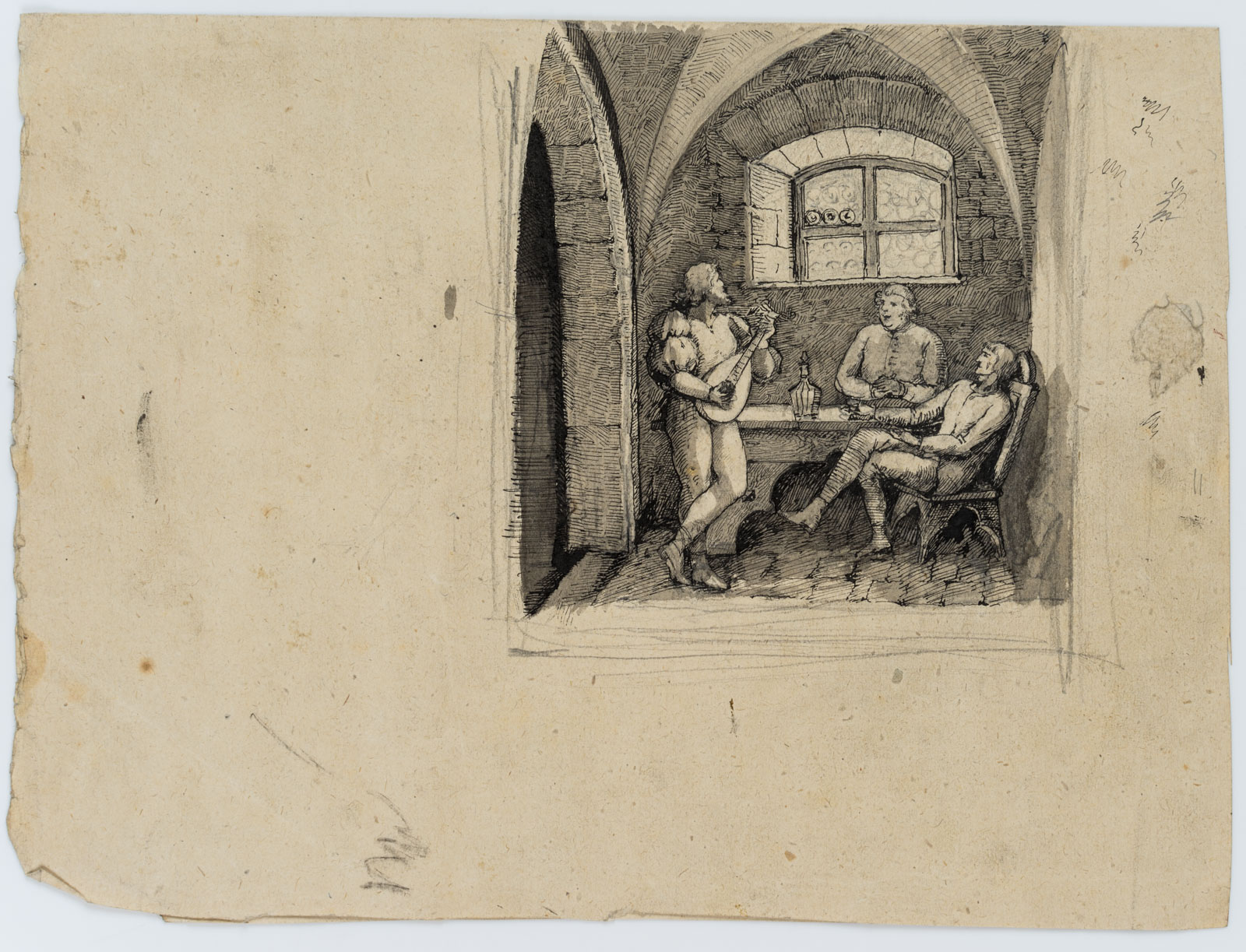 - Description: Sketch or figure and costume study for a history painting by an anonymous artist from the circle of German late Romanticism or the Nazarenes. Showing a lively scene in a vaulted cellar with a musician strumming a lute. On the margins of the sheet there are numerous line tracings. On the verso is a sketch of a young man climbing a mountain. The sheet comes from a sketchbook by an anonymous artist from the circle of the famous history painter Moritz von Schwind (1804 Vienna – 1871 Niederpöcking), who is one of the most important painters of the German late Romantic period. As in Schwind’s works, the sketchbook contains numerous depictions of history scenes or illustrations of fairy tales and legends as well as religious themes.