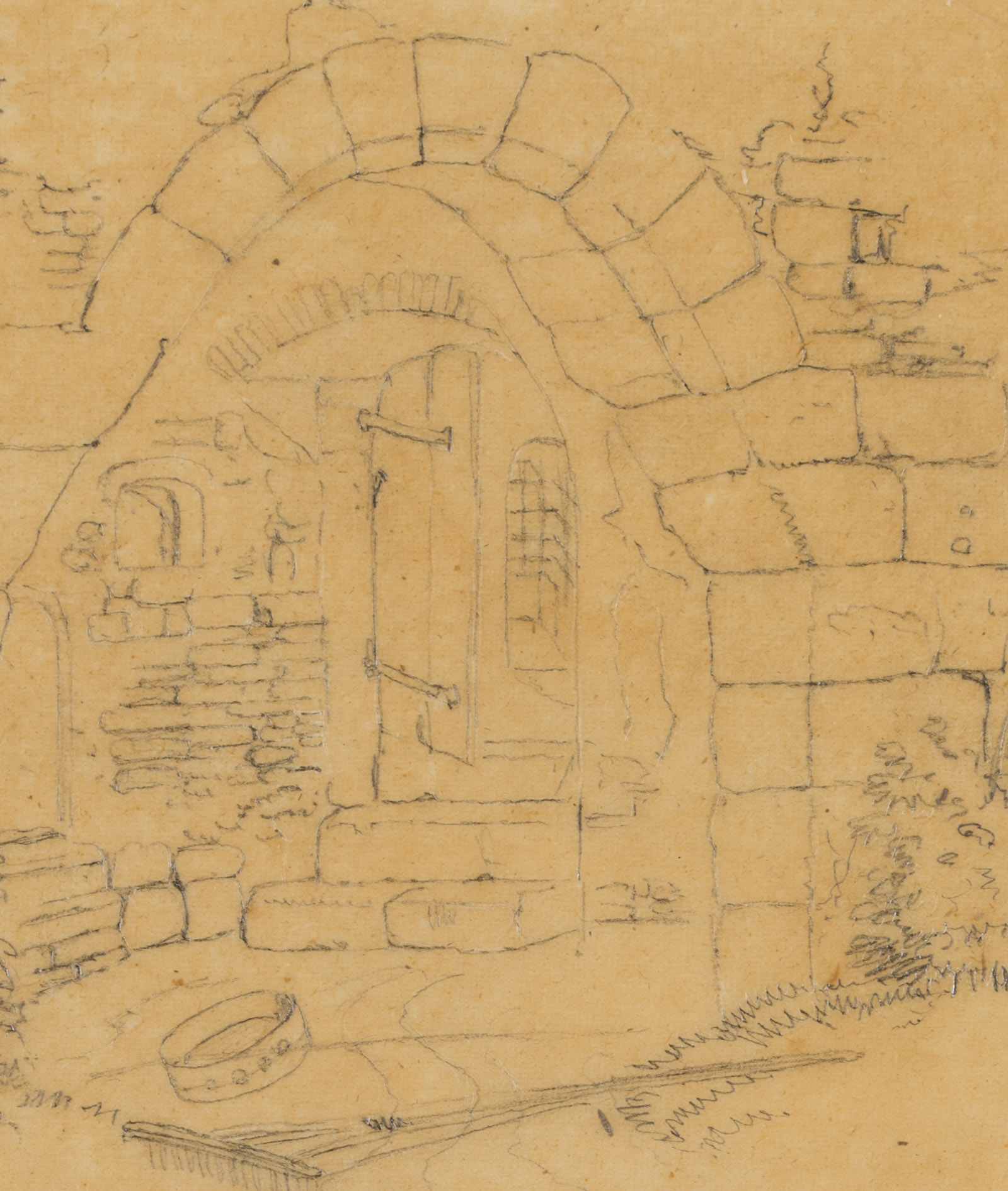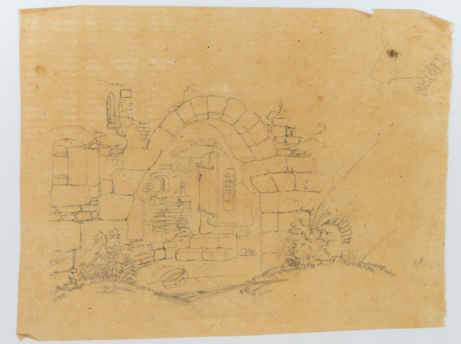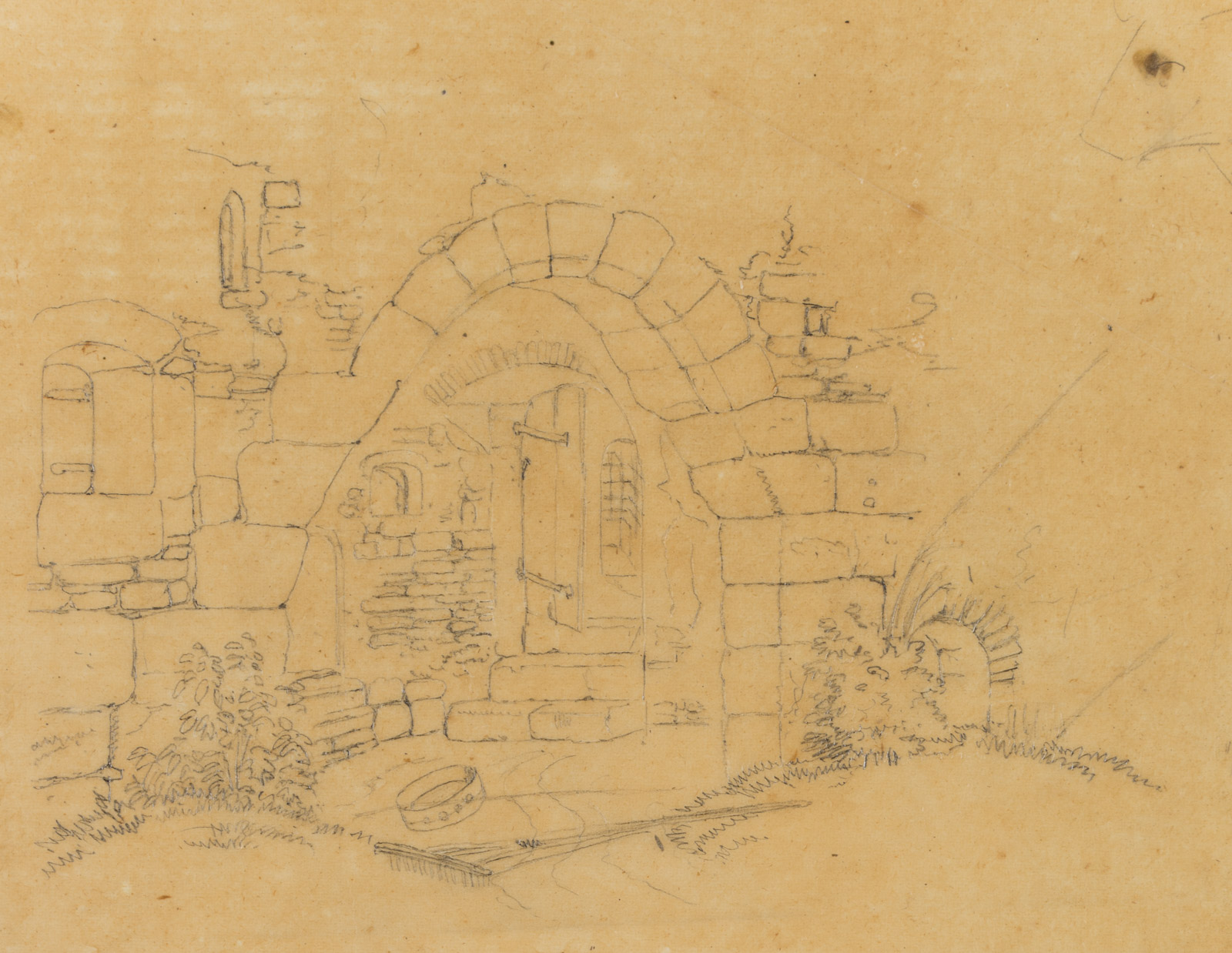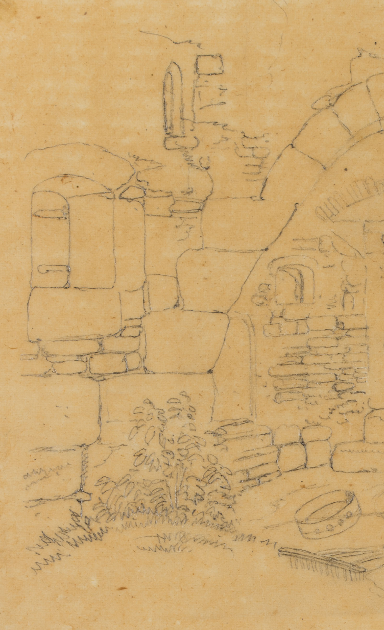 Moritz von Schwind (1804 Vienna – 1871 Munich) Circle, Romantic ruin with harvesting tools, c. 1840, Pencil