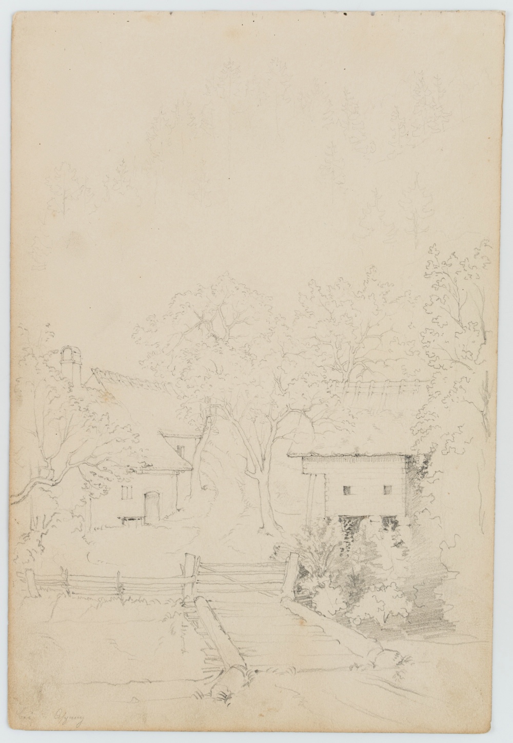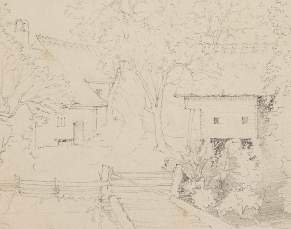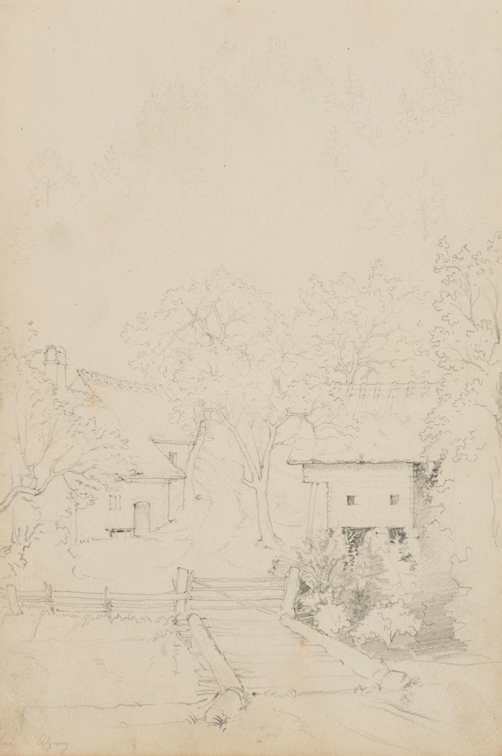 Übungszeichnung eines anonymen Künstlers aus dem Umkreis der deutschen Spätromantik oder der Nazarener. Zeigt den vermutlich spontan eingefangenen Blick des Künstlers vom Reiseweg auf die Häuser einer kleinen Ortschaft und könnte bei einer Studienreise entstanden sein. Das Blatt stammt aus einem Skizzenbuch eines anonymen Künstlers aus dem Umkreis des berühmten Historienmalers Moritz von Schwind (1804 Wien – 1871 Niederpöcking), der zu den bedeutendsten Malern der deutschen Spätromantik zählt. Wie im Werke Schwinds enthält das Skizzenbuch zahlreiche Darstellungen zu Historienszenen oder Illustrationen von Märchen- und Sagenstoff sowie religiösen Themen.