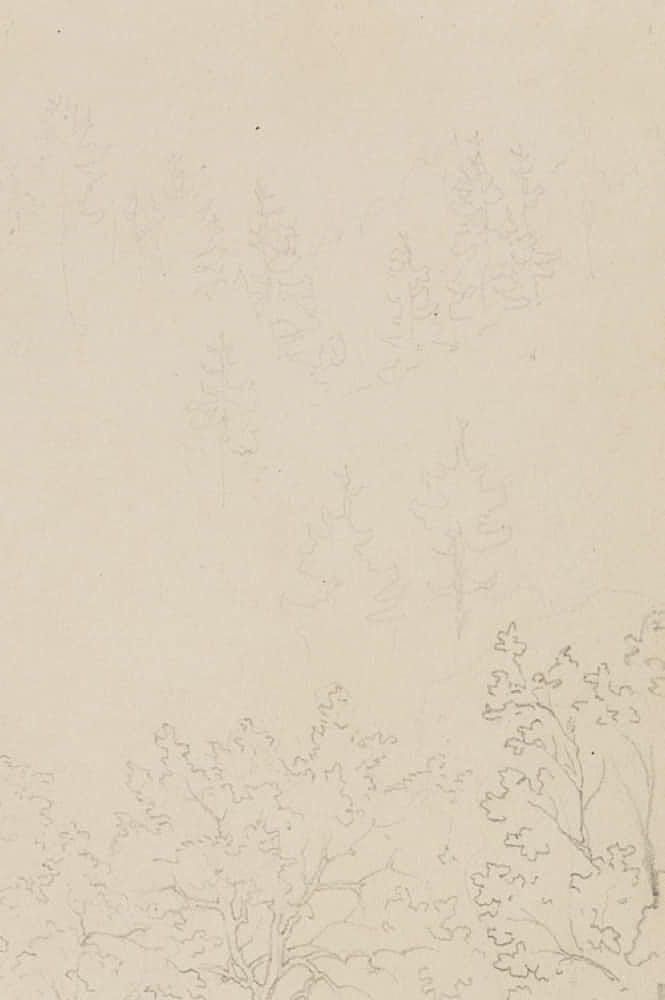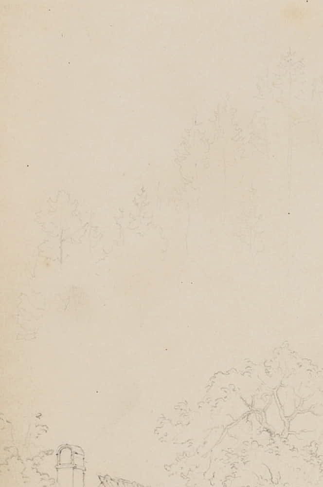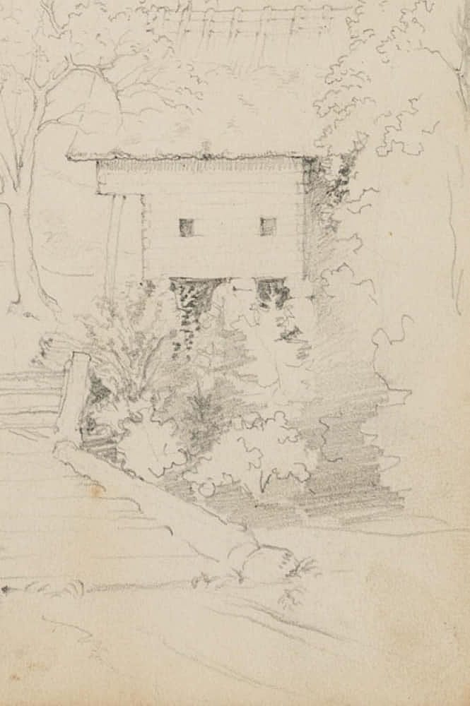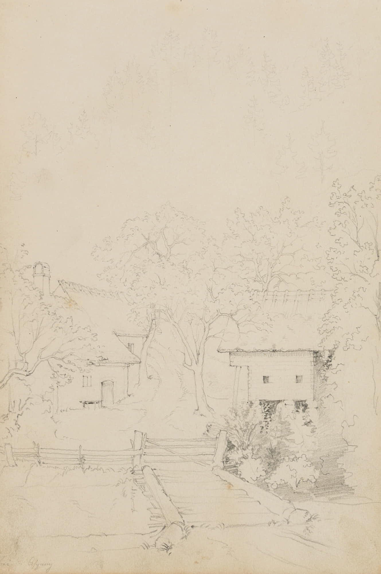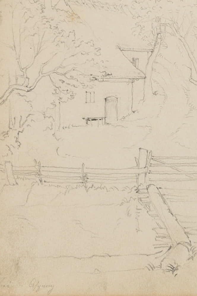 Übungszeichnung eines anonymen Künstlers aus dem Umkreis der deutschen Spätromantik oder der Nazarener. Zeigt den vermutlich spontan eingefangenen Blick des Künstlers vom Reiseweg auf die Häuser einer kleinen Ortschaft und könnte bei einer Studienreise entstanden sein. Das Blatt stammt aus einem Skizzenbuch eines anonymen Künstlers aus dem Umkreis des berühmten Historienmalers Moritz von Schwind (1804 Wien – 1871 Niederpöcking), der zu den bedeutendsten Malern der deutschen Spätromantik zählt. Wie im Werke Schwinds enthält das Skizzenbuch zahlreiche Darstellungen zu Historienszenen oder Illustrationen von Märchen- und Sagenstoff sowie religiösen Themen.