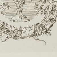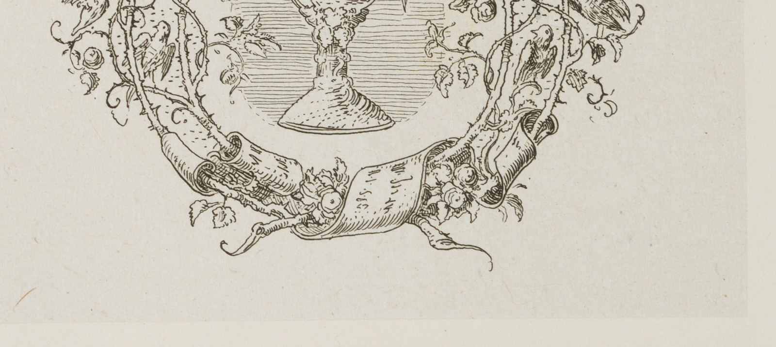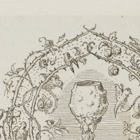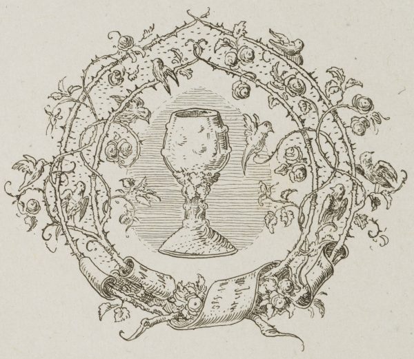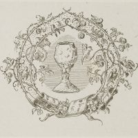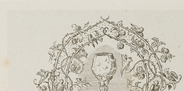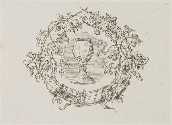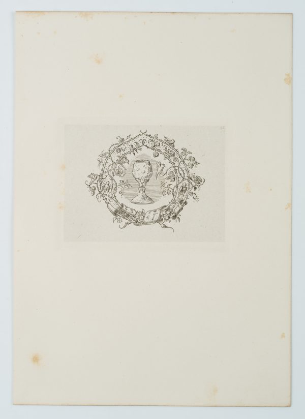 - Description: Numbered „24.“ In the centre of a wreath of two thorny rose tendrils each with buds, leaves and blossoms, in which dainty nightingales sit, is a chalice decorated with wine berries and leaves. The etching is from an album published in 1875 with 42 small-format etchings by Moritz von Schwind and poems/verses by Ernst Freiherr von Feuchtersleben on the subject of „smoking“ and „drinking“ (In vino veritas). The explanatory text for this depiction in the album reads: „Euer Becher Bild zu schmücken sei euch nicht um Neues Bang! No time will succeed more beautifully than through love and song. And of roses and nightingales – be the theme ever so old – the poet’s lip will slur until their last breath dies away! – „