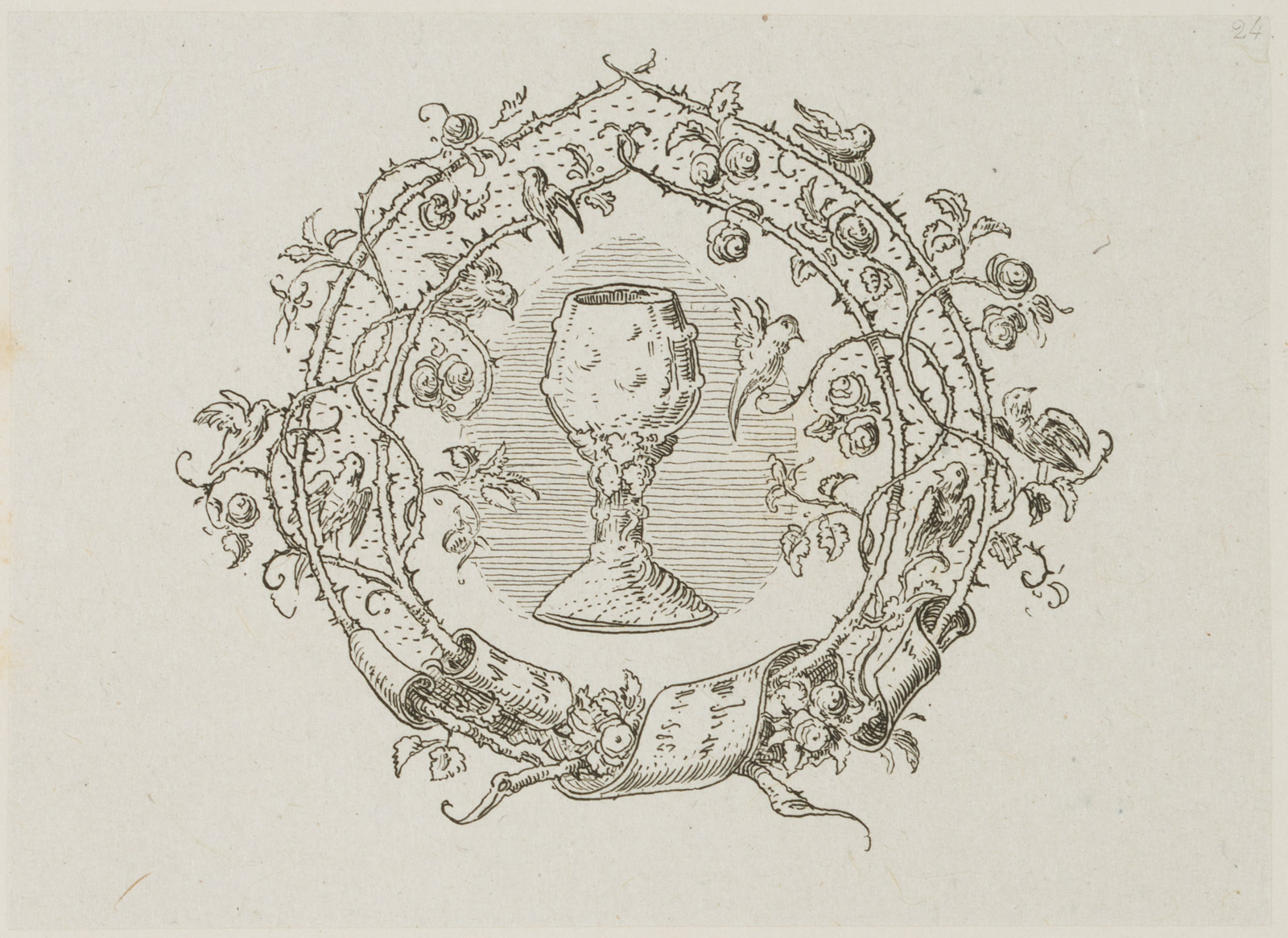 - Beschreibung: Rechts oben oberhalb der Darstellung auf Platte nummeriert „24.“ Im Zentrum eines Kranzes aus jeweils zwei dornigen Rosenranken mit Knospen, Blättern und Blüten, in denen zierliche Nachtigallen sitzen, steht ein mit Winbeeren und -blättern verzierter Kelch. Die Radierung stammt aus einem 1875 erschienenen Album mit 42 kleinformatigen Radierungen von Moritz von Schwind und Gedichten/Versen Ernst Freiherr von Feuchterslebens zum Thema „Rauchen“ und „Trinken“ (In vino veritas). Der erläuternde Text zu dieser Darstellung im Album lautet: „Euer Becher Bild zu schmücken sei euch nicht um Neues Bang! Keiner Zeit wird’s schöner glücken, als durch Liebe und Gesang. Und von Ros‘ und Nachtigallen – sei das Thema noch so alt – wird des Dichters Lippe lallen, bis ihr letzter Hauch verhallt! – “
