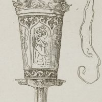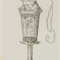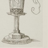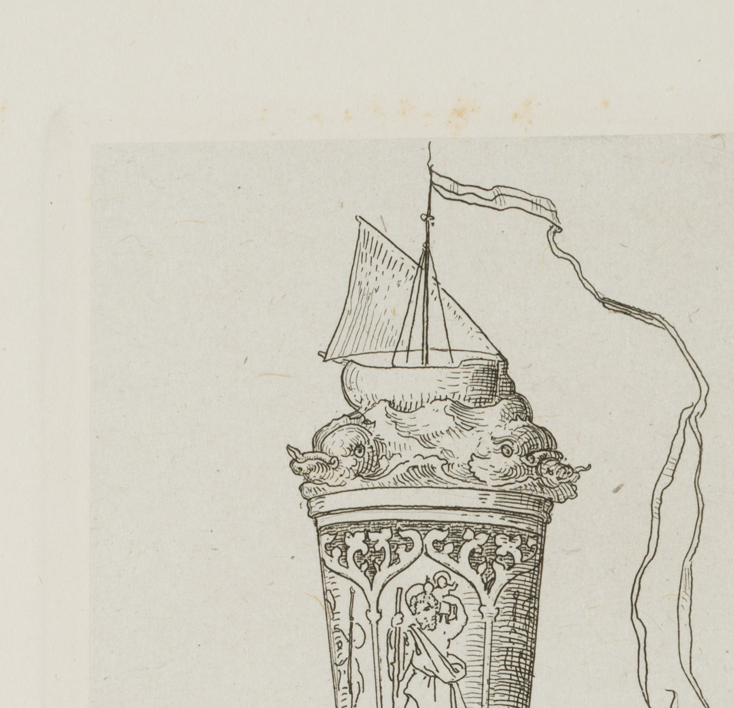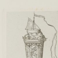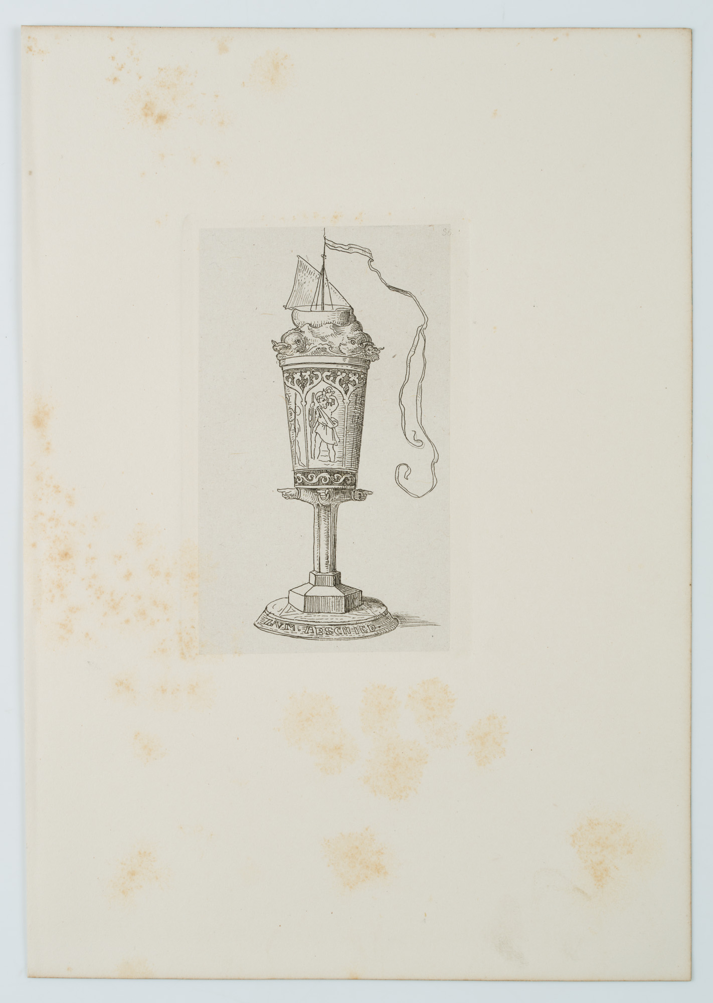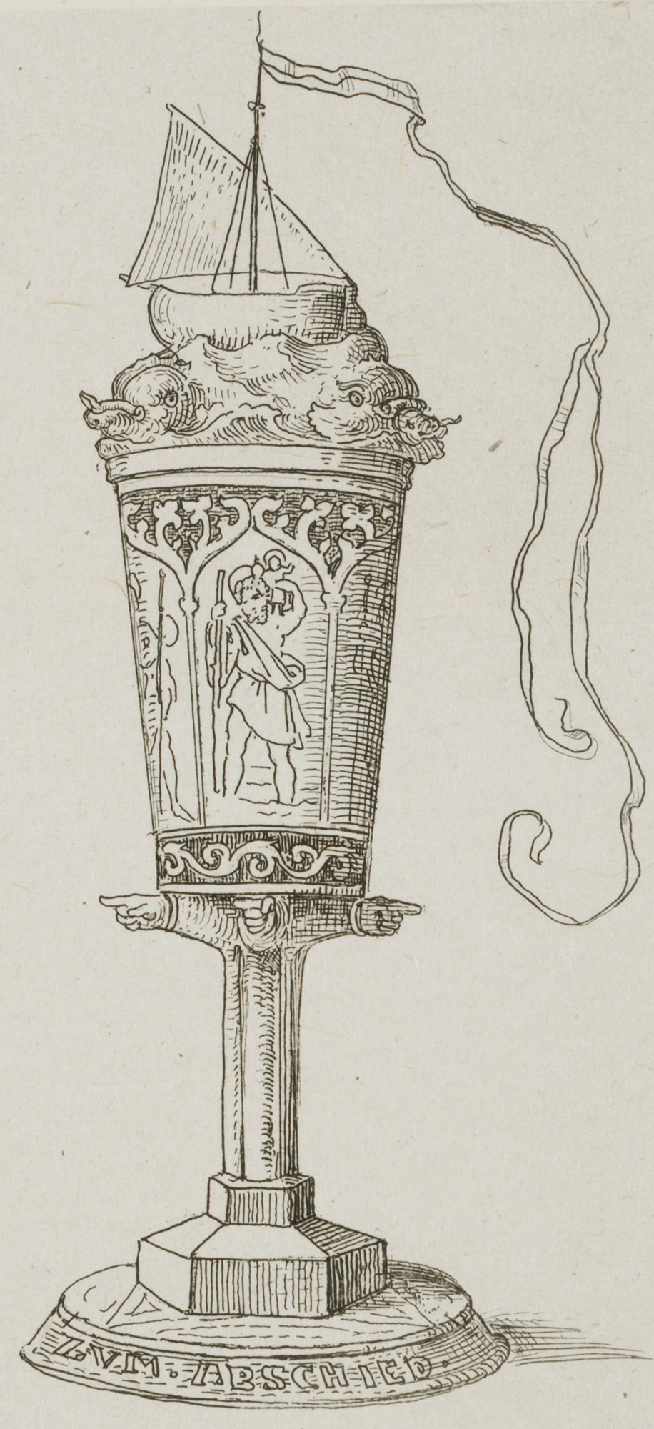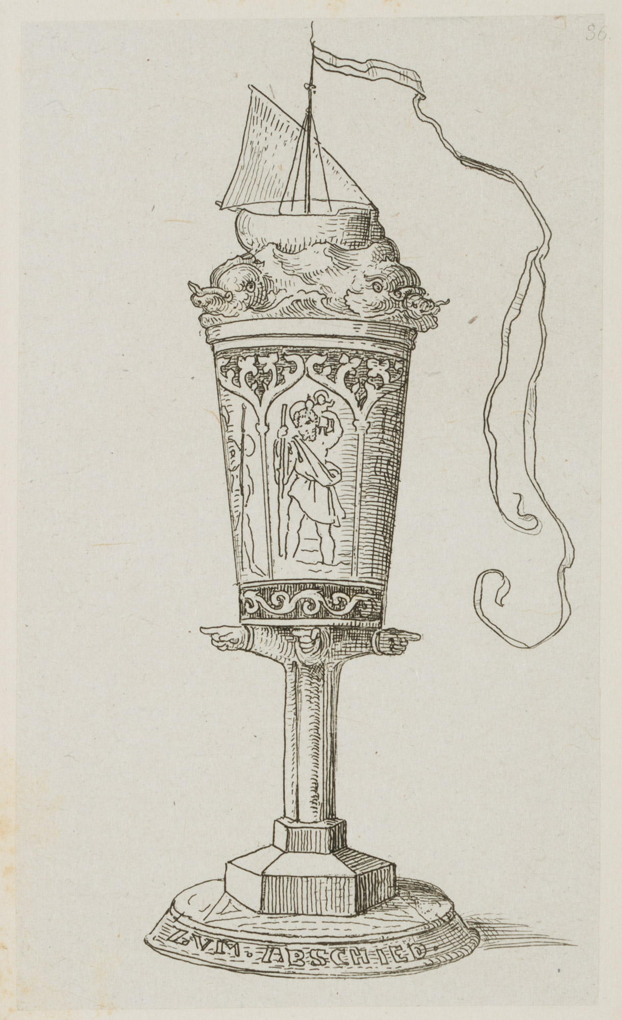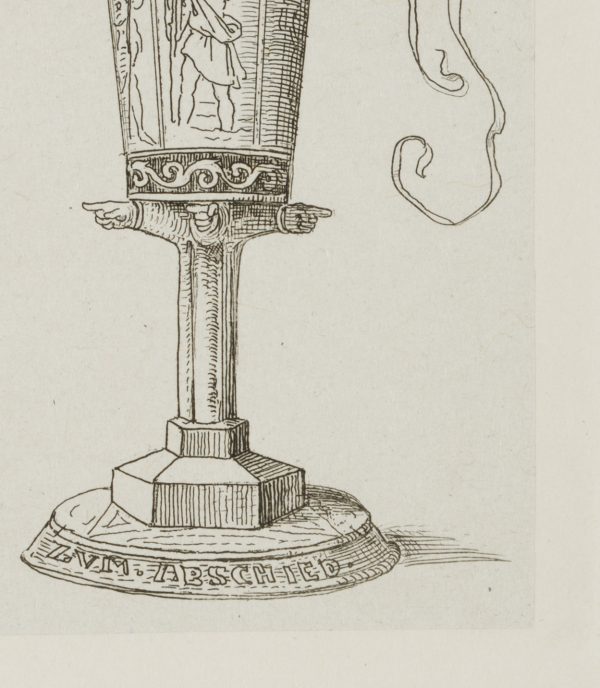 - Description: A sailing ship on an unruly sea with a waving long winpel crowns the chalice. The cuoppa is decorated with images of saints in entwined arcades, the figure of St. Christopher carrying the infant Jesus on his shoulder is recognisable. The cuppa is carried on (probably a total of six) outstretched forearms, the hands pointing in the respective direction. The inscription “ZUM ABSCHIED” appears at the foot. The etching is from an album published in 1875 with 42 small-format etchings by Moritz von Schwind and poems/verses by Ernst Freiherr von Feuchtersleben on the subject of “smoking” and “drinking” (In vino veritas). The explanatory text for this depiction in the album reads: “To you, wanderers, a valete – wanderers by land and sea! Reminiscite, favete, merrily hither, and merrily hither! Vir probatus fiat probus means: be honest and prudent; Christopher, Rochus and Jakobus be your shield and escort!