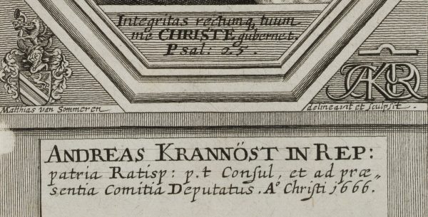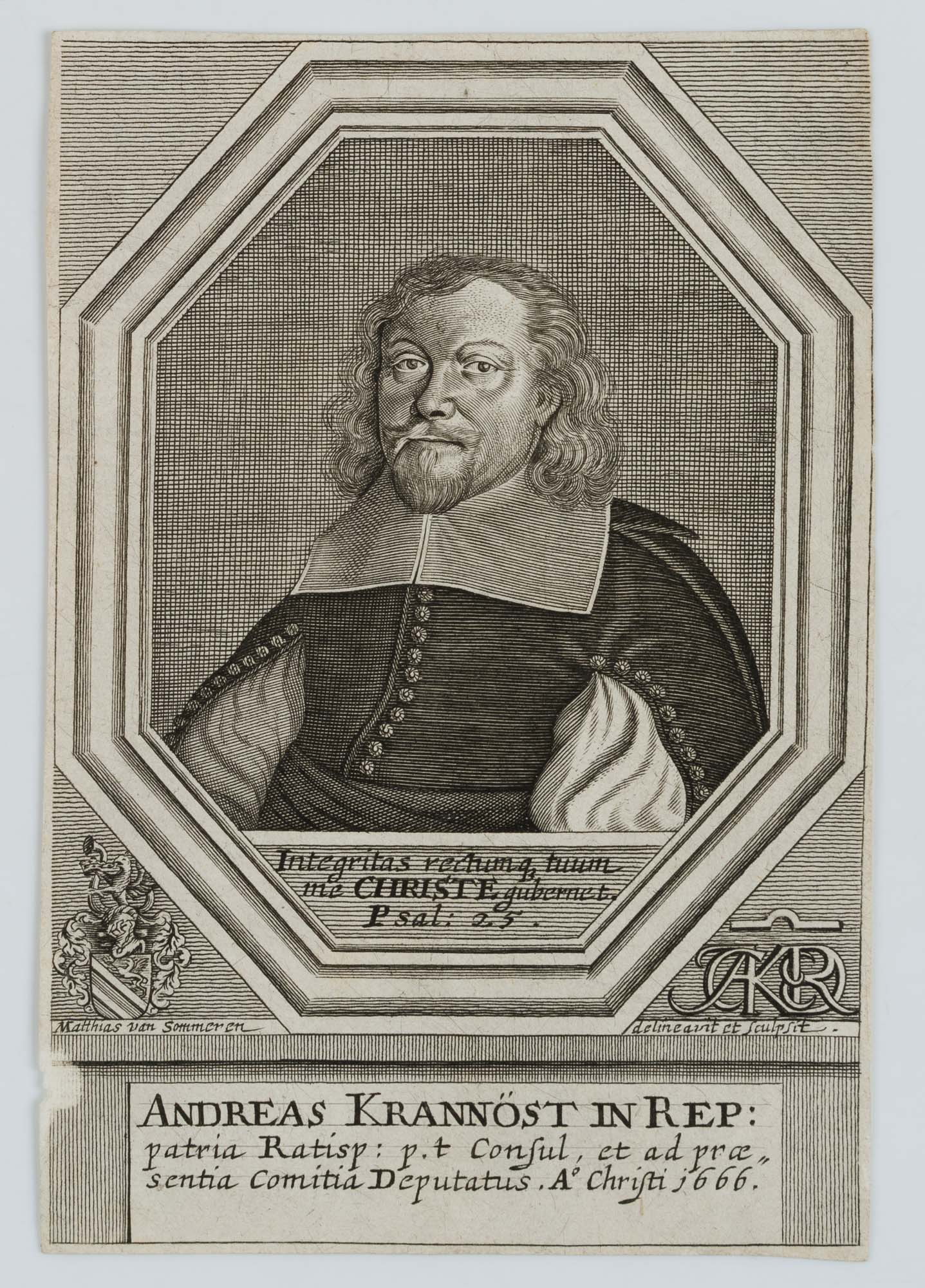 - Description: Belt painting of Andreas Krannöst – engraver-dilettante, mayor in Regensburg – in octagon, with coat of arms and monogram. Signed on the base below the depiction “Matthias van Sommeren delineavit et sculpsit” and titled: “Andreas Krannöst in Rep. Patria Ratisp. p. t. Consul. et ad praesentia Comitia Deputatus. Ao. Christi 1666.”. LITERATURE: Wolfenbüttel 11516; Thieme-Becker 21,427.