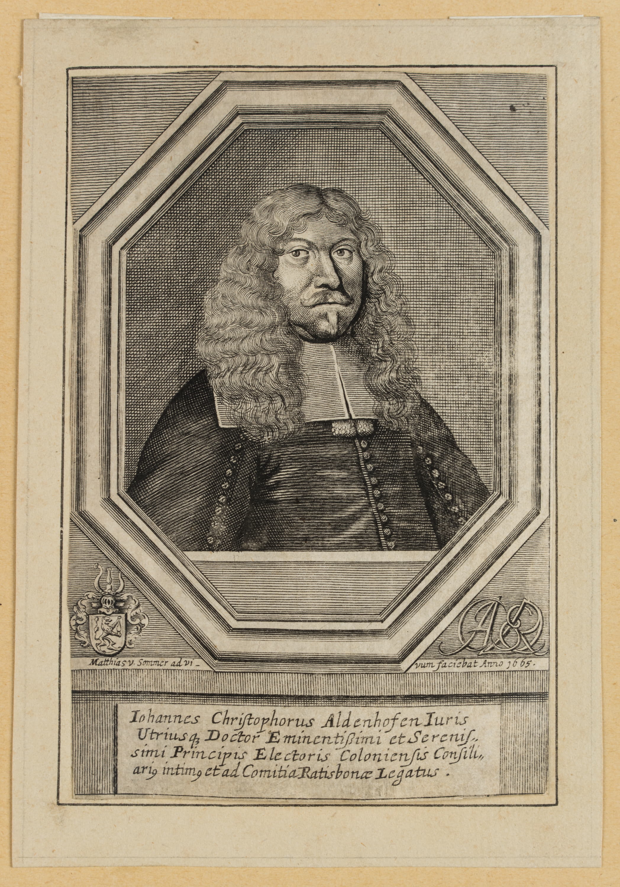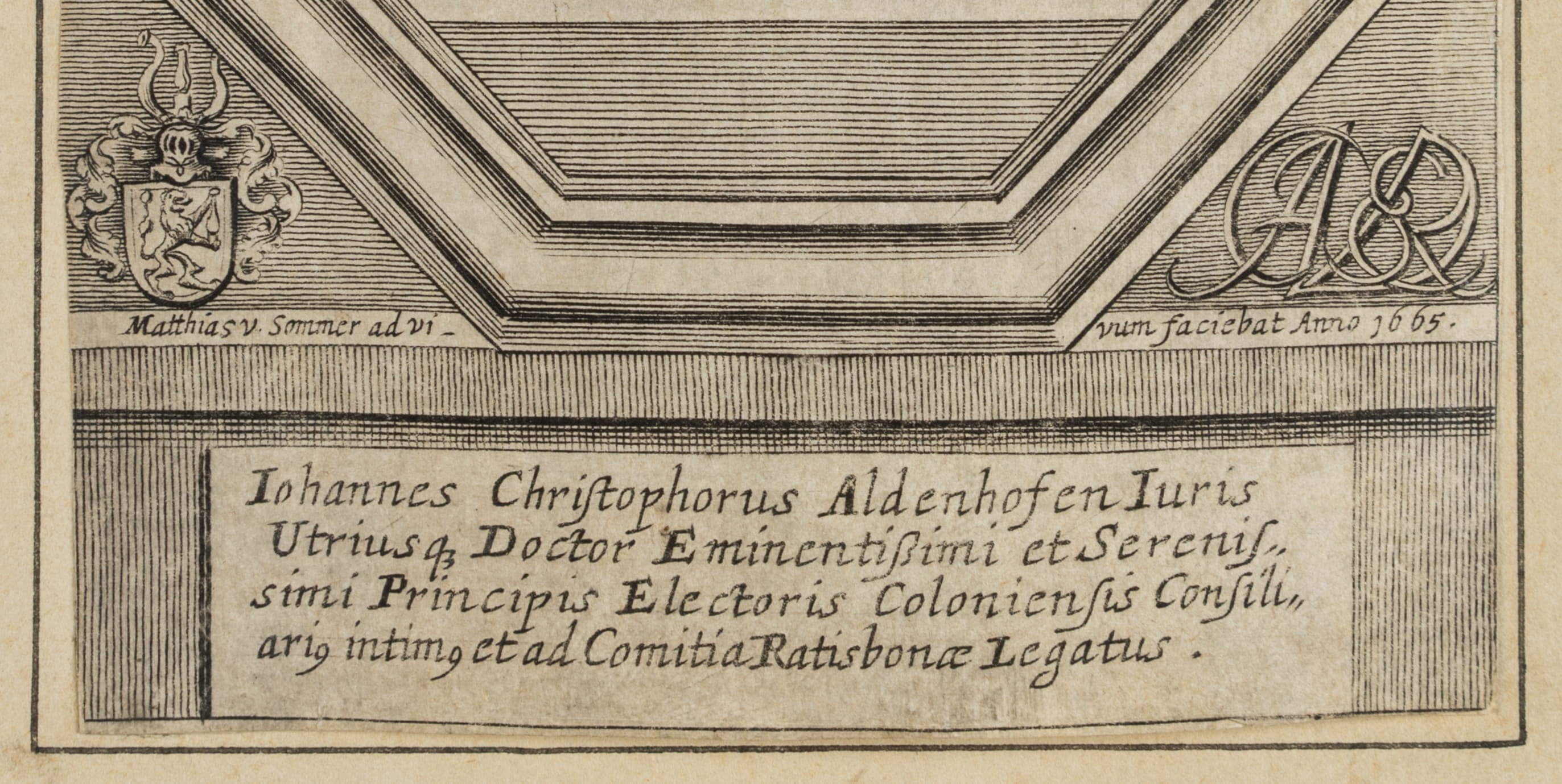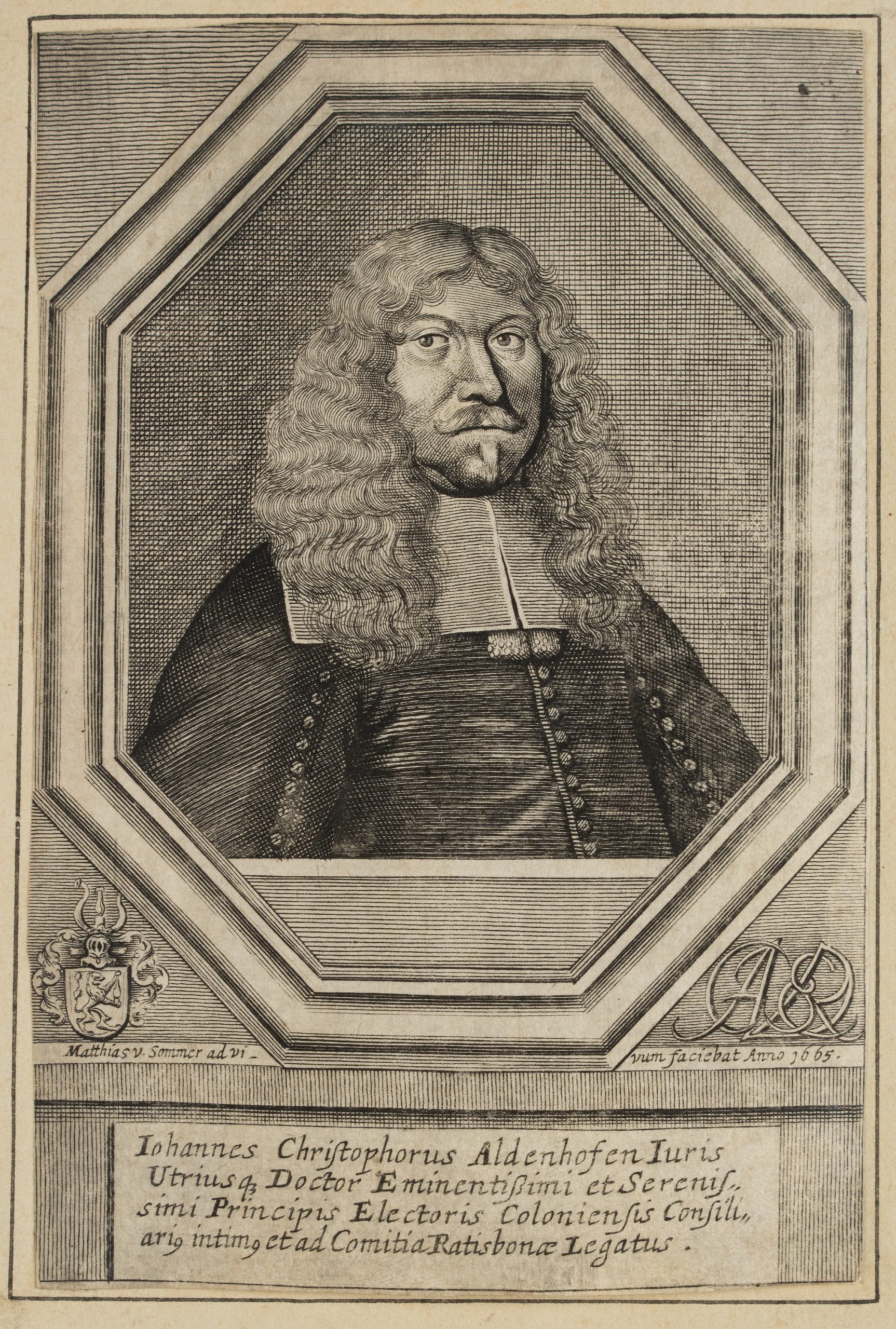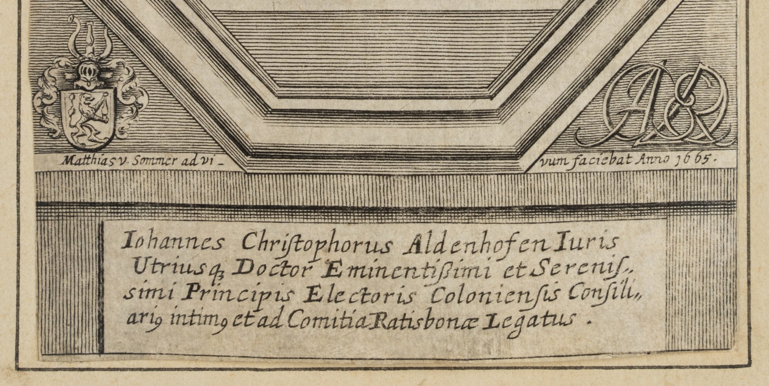 - Bezeichnung: Unterhalb der Darstellung in der Druckplatte signiert und datiert “Matthias v. Sommer ad vivum faciebat Anno 1665”, darunter bezeichnet “Iohannes Christophorus Aldenhofen [..]”