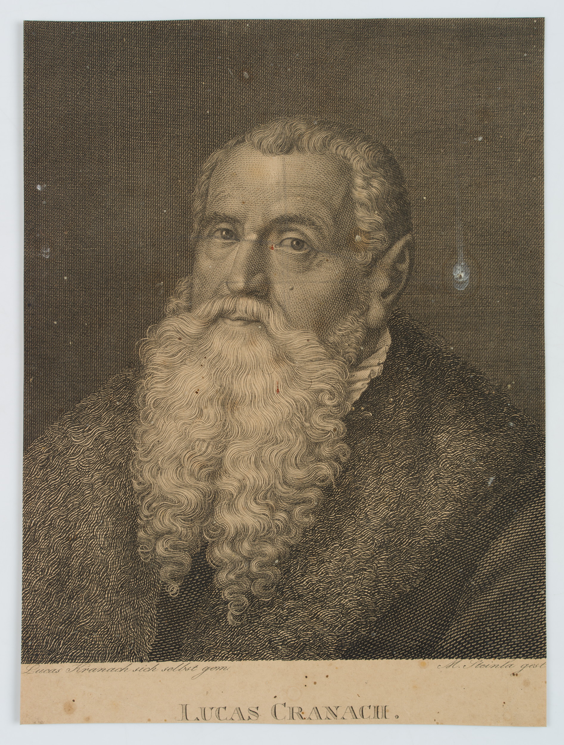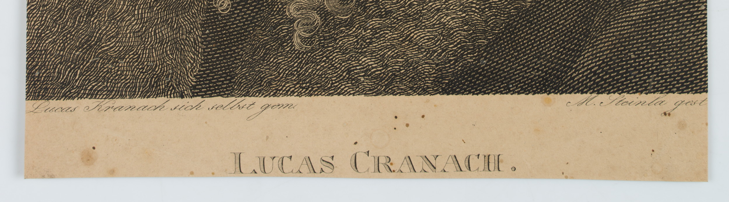 - Bezeichnung: Unten im Druck signiert: “Lucas Cranach sich selbst gem. | M. Steinla gest.”. Unten im Druck bezeichnet: “Lucas Cranach”.
