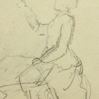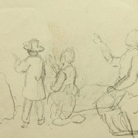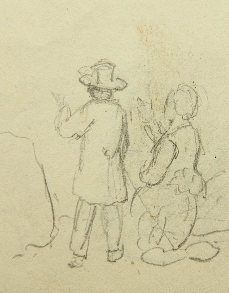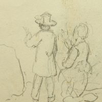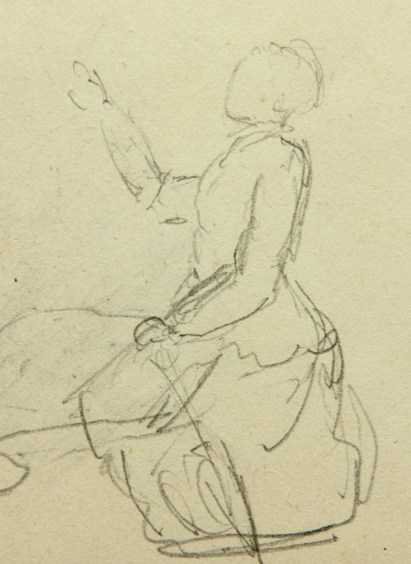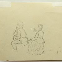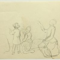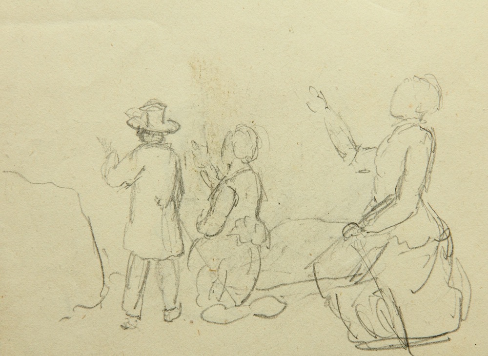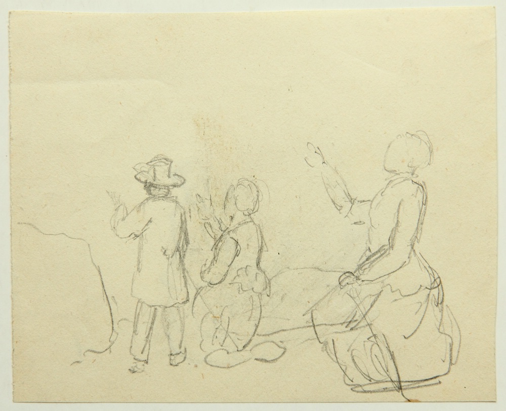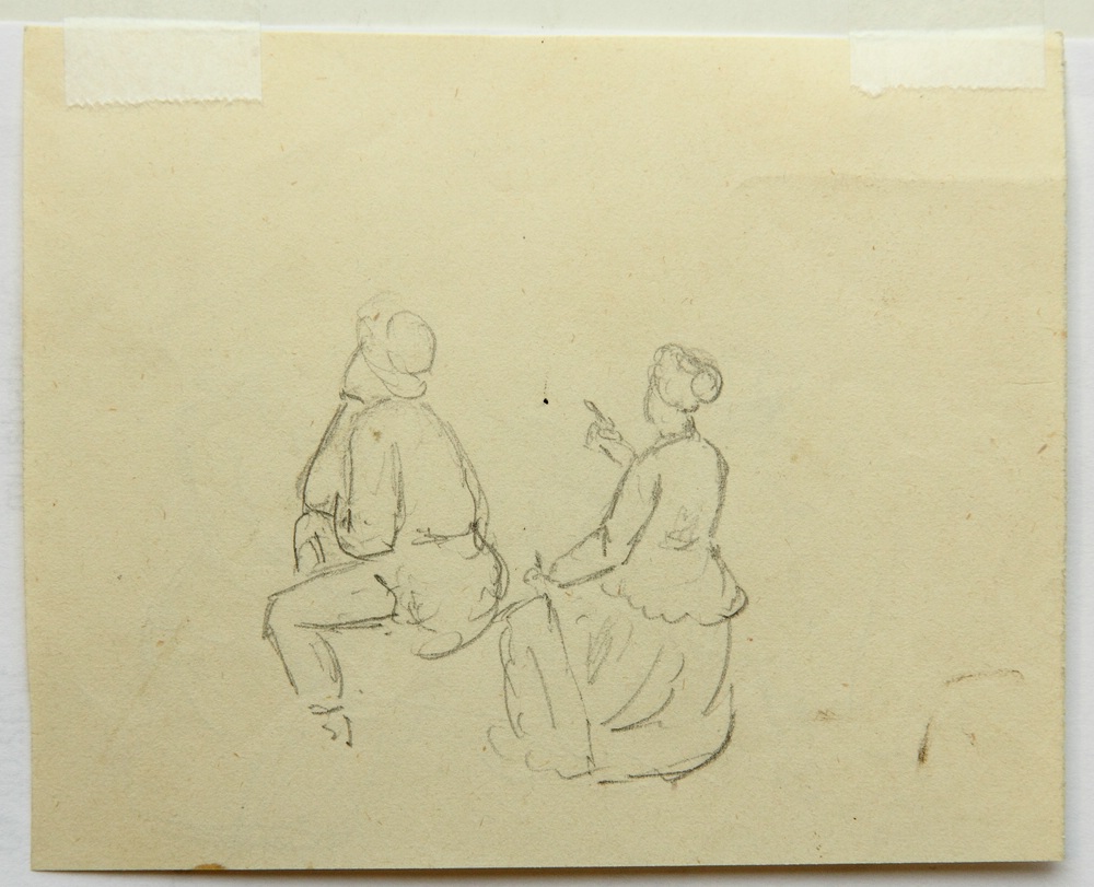 - Description: Sketchy depiction of a boy with frock coat and top hat and a girl in a dress in back view as well as a squatting lady in a wide dress. On the reverse is another pencil sketch showing a seated man next to a lady in back view.