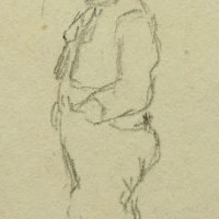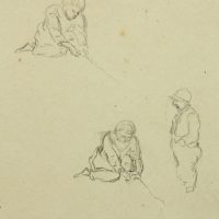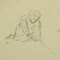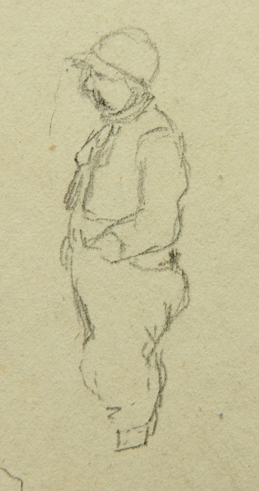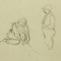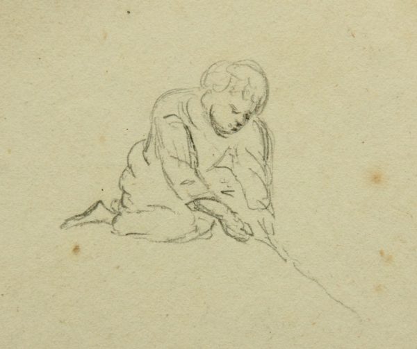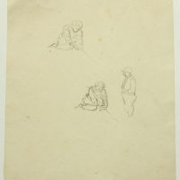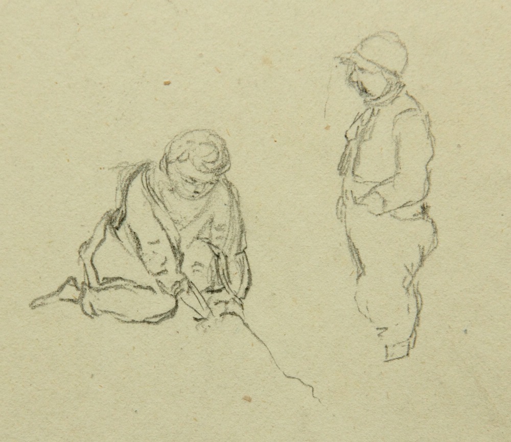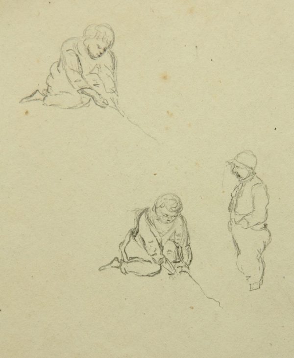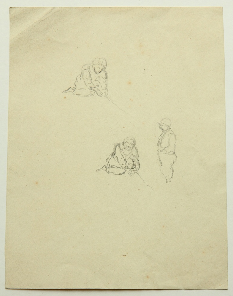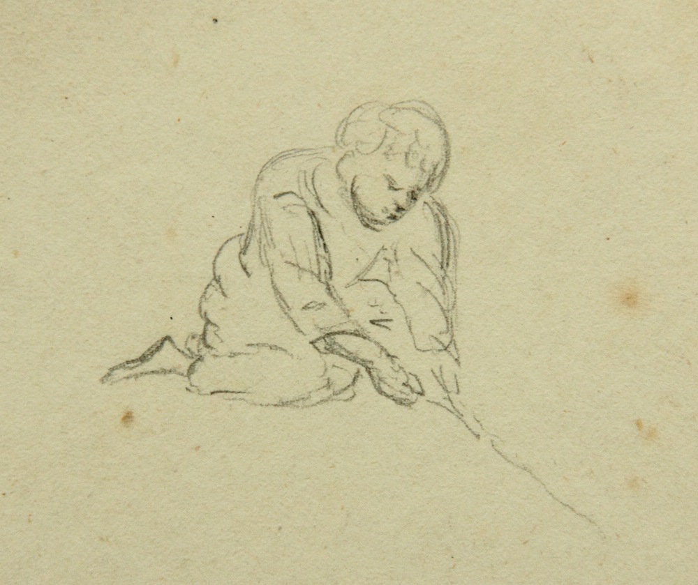 - Description: Sketchy depiction of a squatting boy in three-quarter view beside an indicated standing man.