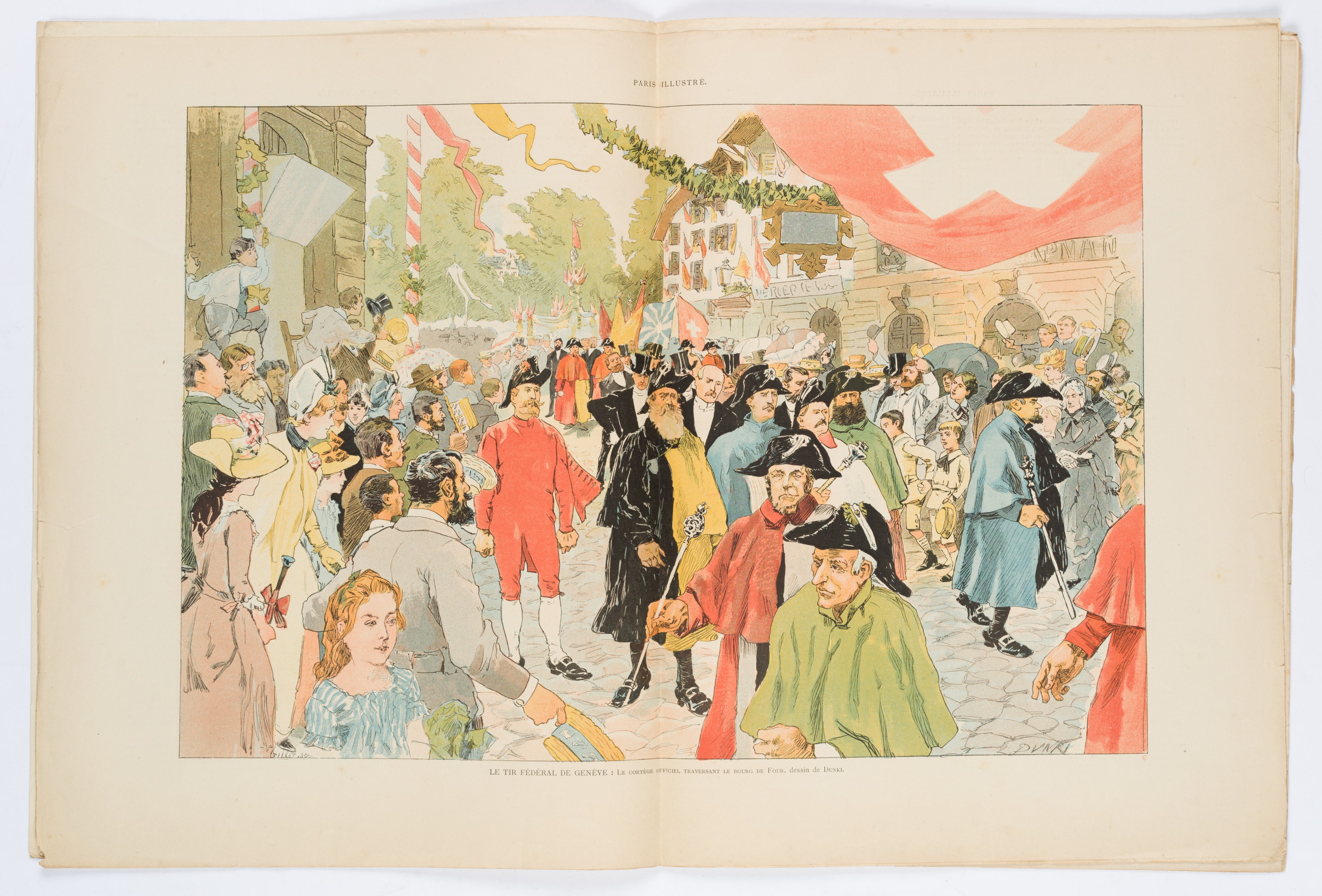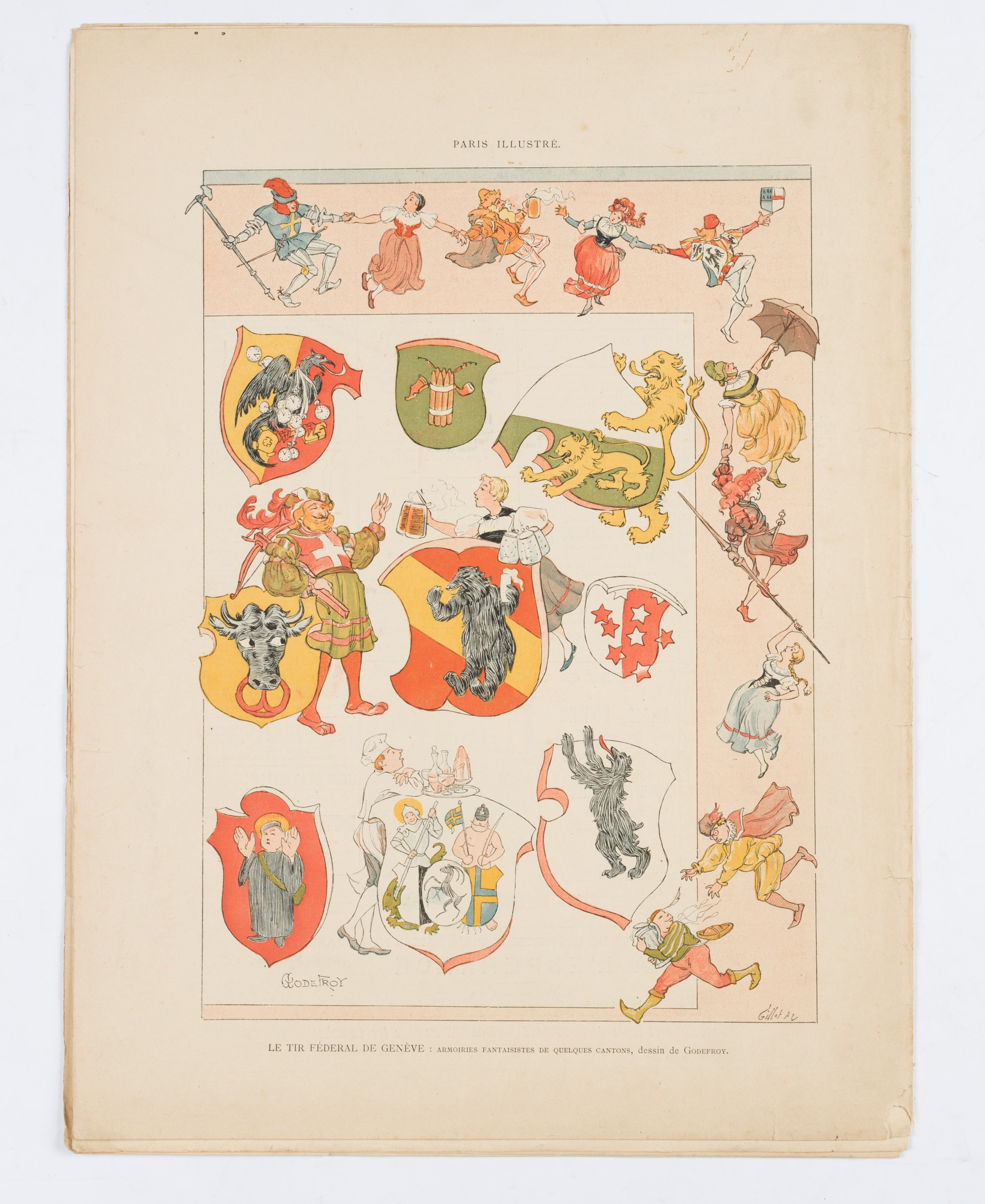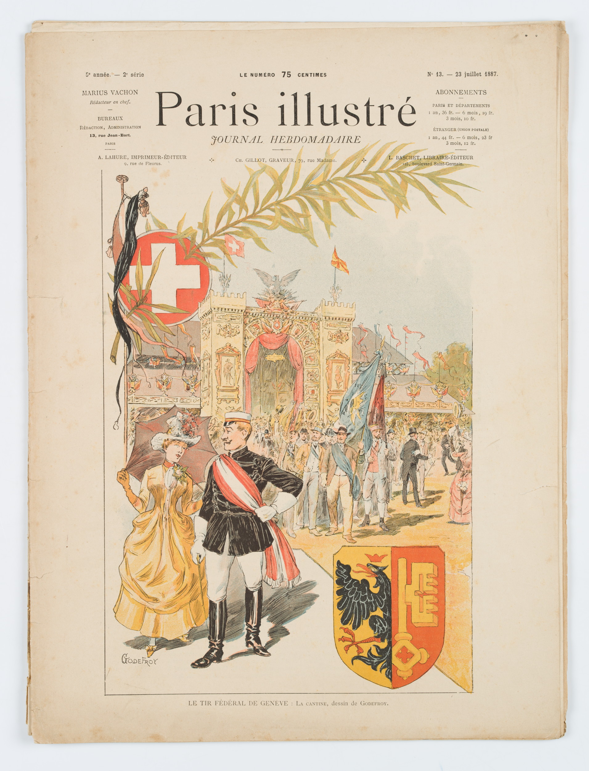 • Description: With the Federal Shooting Festival “Le Tir fédéral” 1887 in Geneva as the title theme. With coloured illustrations by Godefrey Durand, Dunki, Simon Durand, D. Smoulin, Deroy and Francis Chomel. The booklet comprises 16 printed pages.
