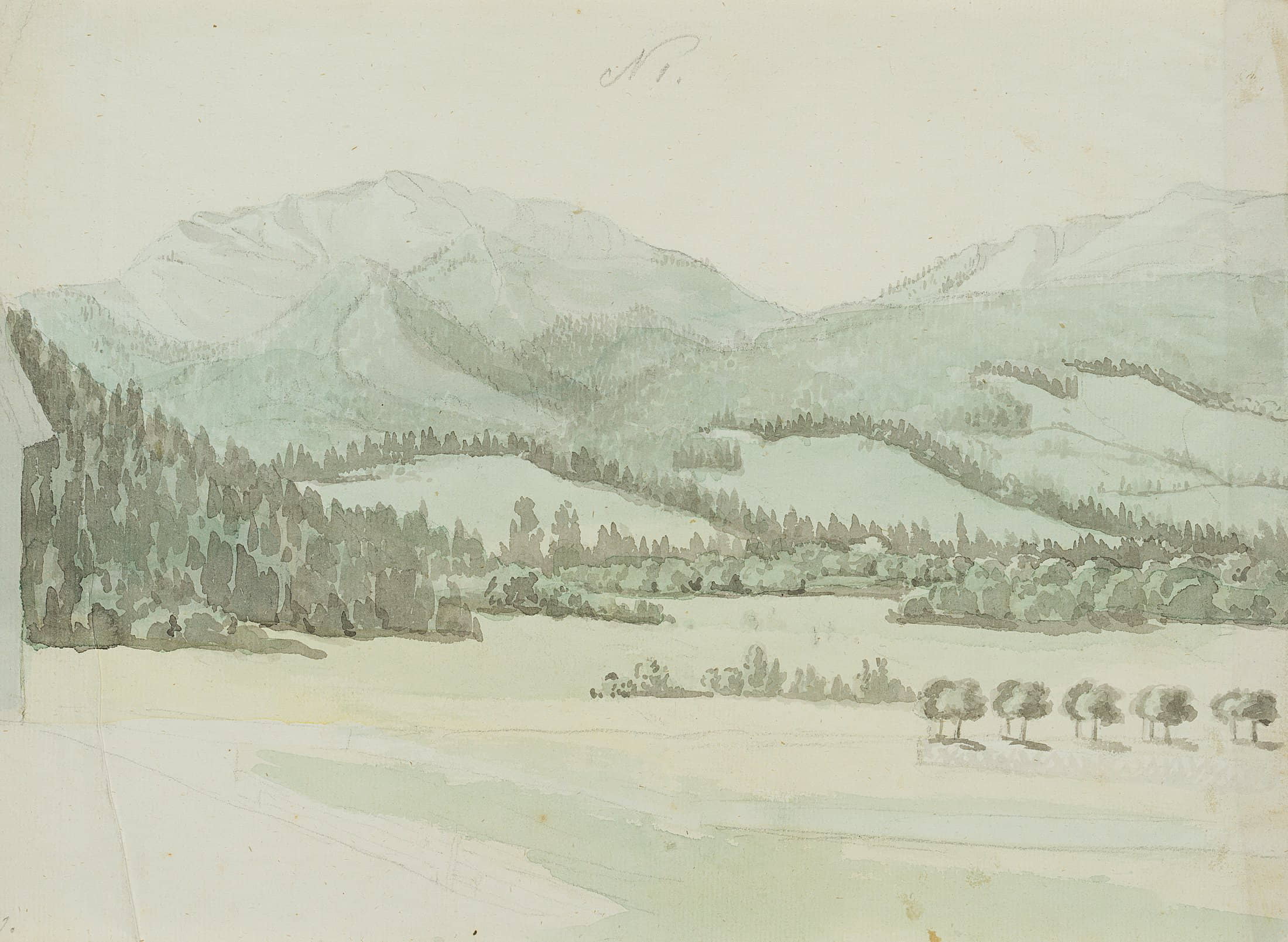 Max Josef Wagenbauer (1774 Öxing – 1829 Munich), Benediktbeuren, Panorama of the Bavarian High Mountains, c. 1800, Watercolor