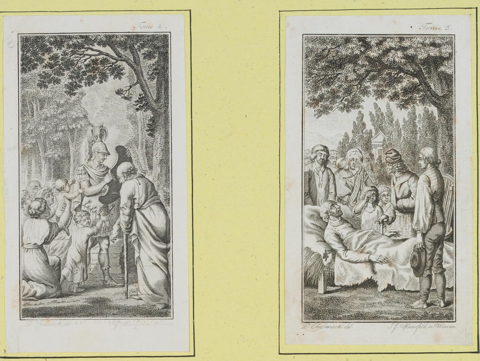 Johann Georg Mansfeld (1764 Wien – 1817 ebd.) nach Daniel Nikolaus Chodowiecki (1726 Danzig – 1801 Berlin), 4 Graphiken mit Szenen von Legionären, Sterbenden, edlen Gefangenen und Orientalen, 18. Jahrhundert, Kupferstich