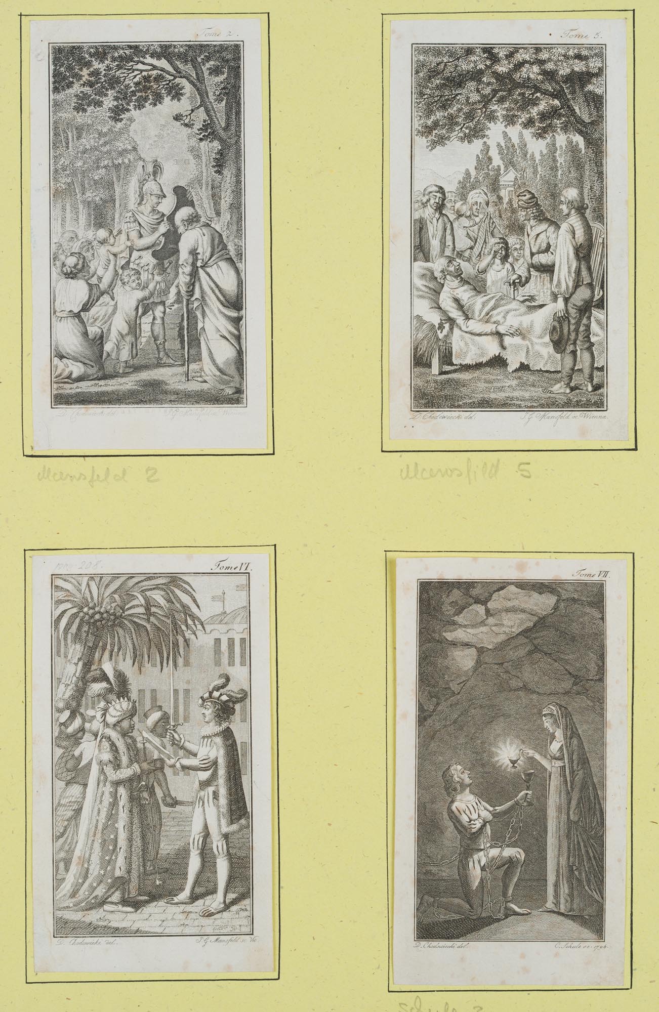 • Beschreibung: Graphiken jeweils unterhalb signiert. Das Blatt rechts unten, Gefangener kniet vor edler Dame, ist rechts unten mit “C. Schule sc.” signiert, die anderen drei Blätter tragen die Signatur “J. G. Mansfeld sc”.