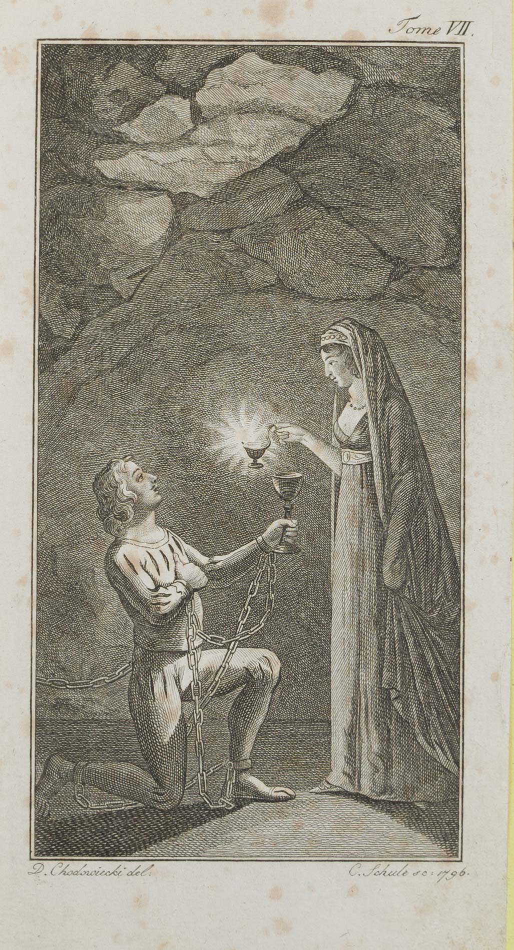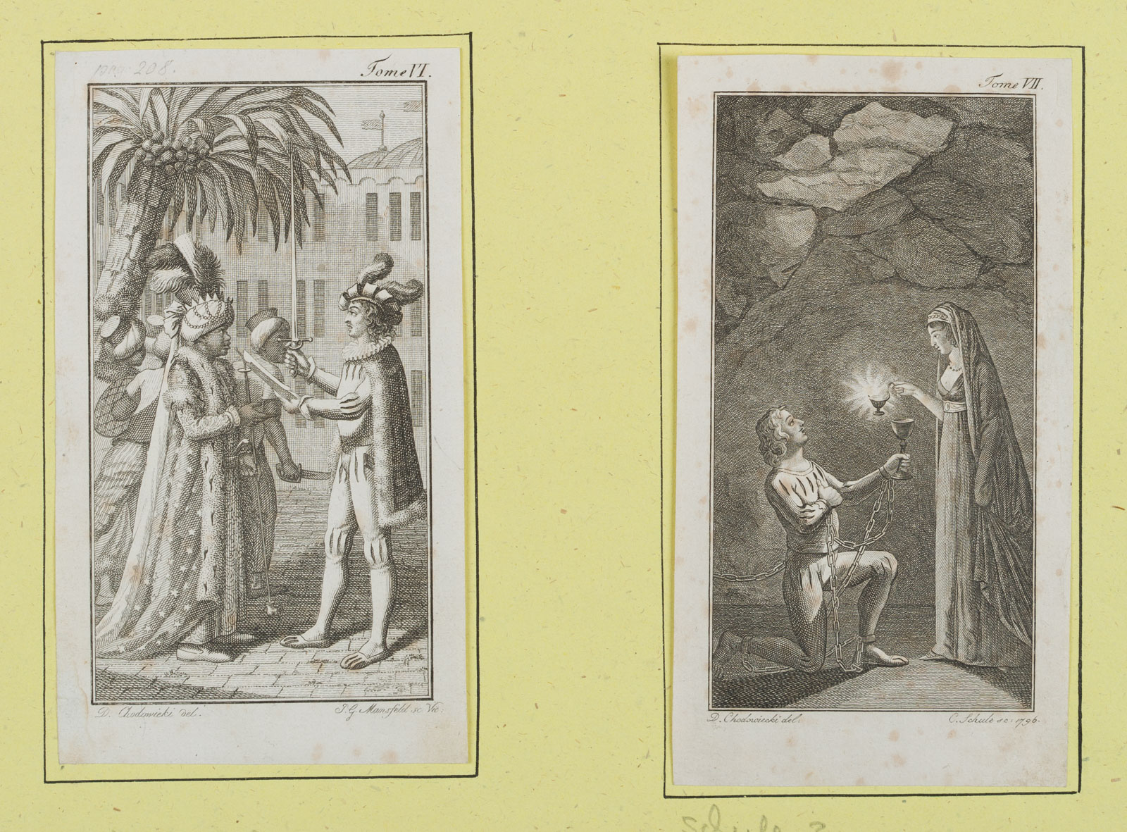 • Description: Each of the prints signed below. The print at lower right, Prisoner kneels before noble lady, is signed “C. Schule sc.” at lower right, the other three prints bear the signature “J. G. Mansfeld sc”.