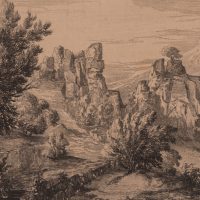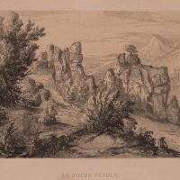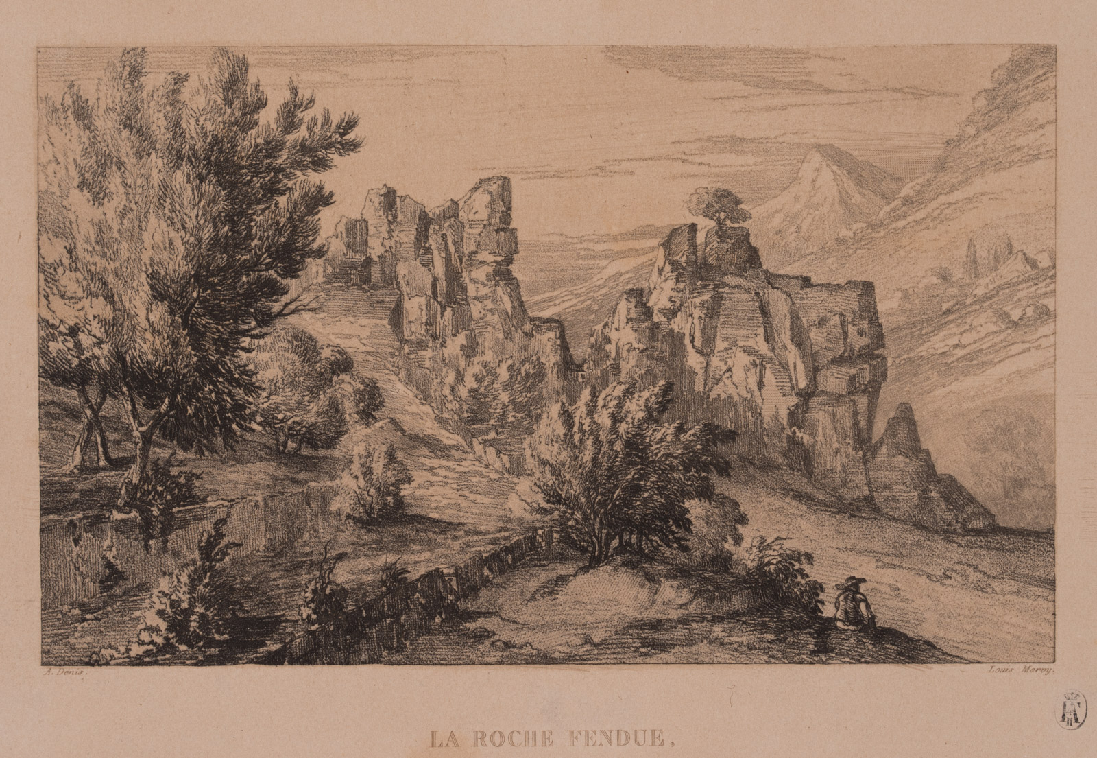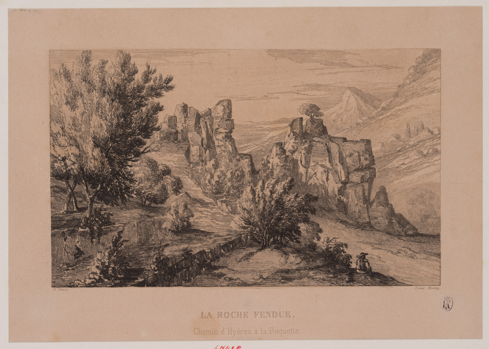 - Beschreibung: Aus einer Serie von Landschaftsgraphiken von Louis Marvy. Der gespaltene Felsen (La Roche Fendue). Weg von Hyères nach La Roquette.