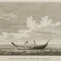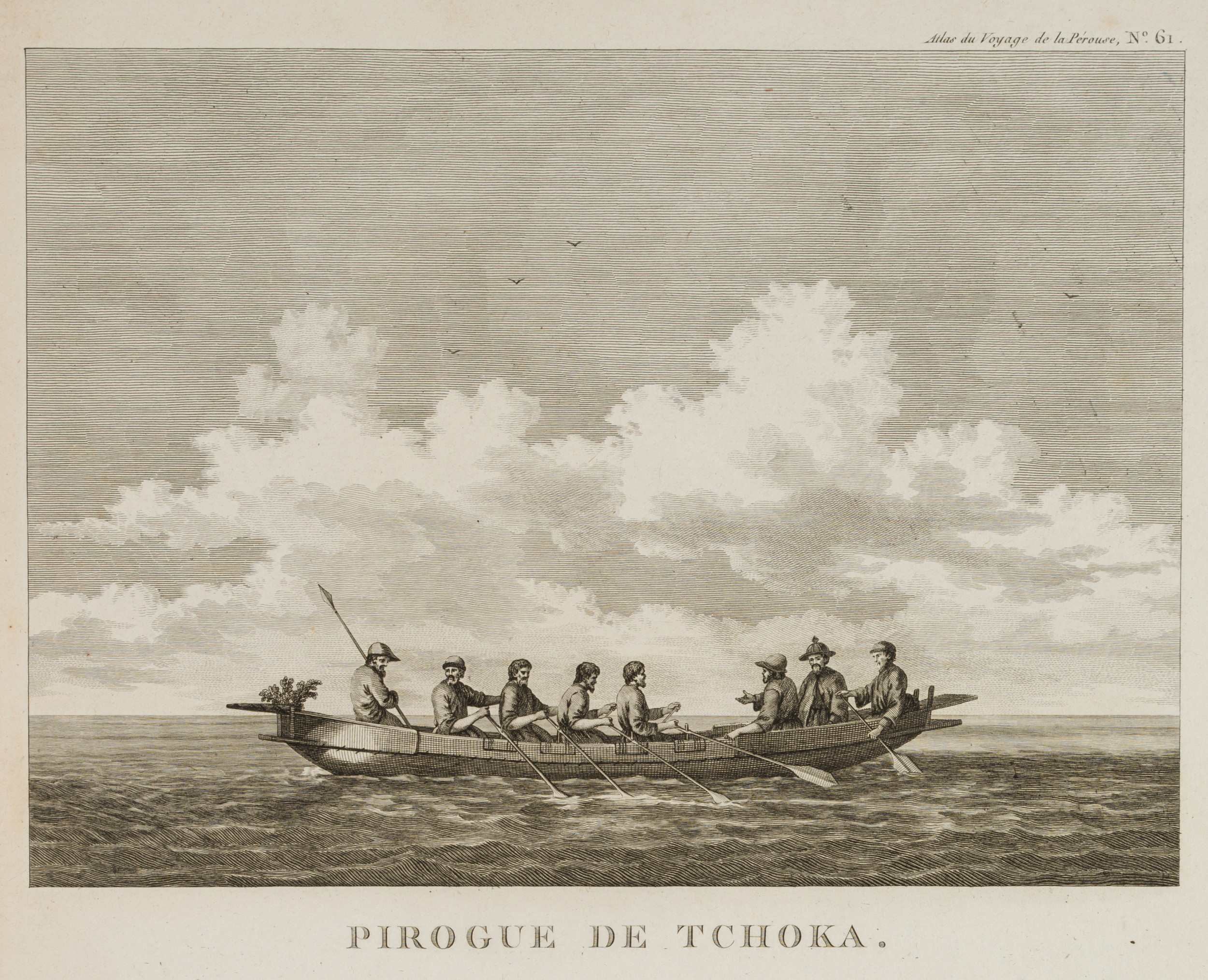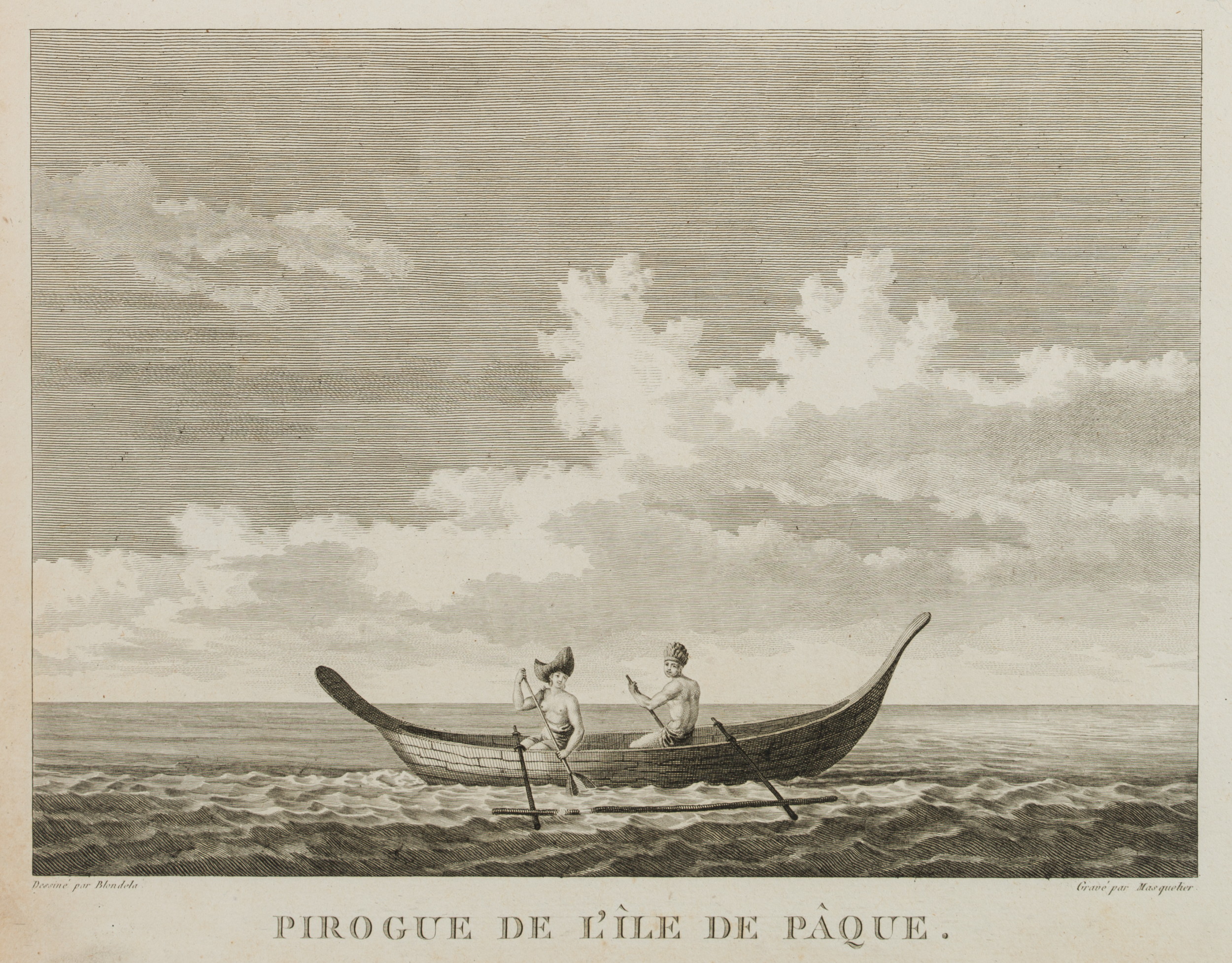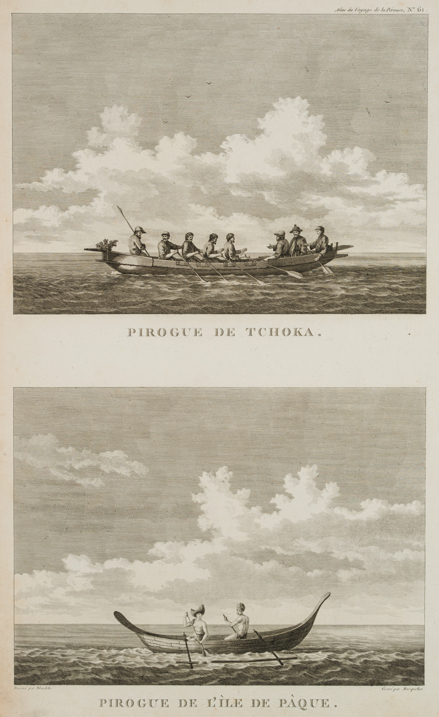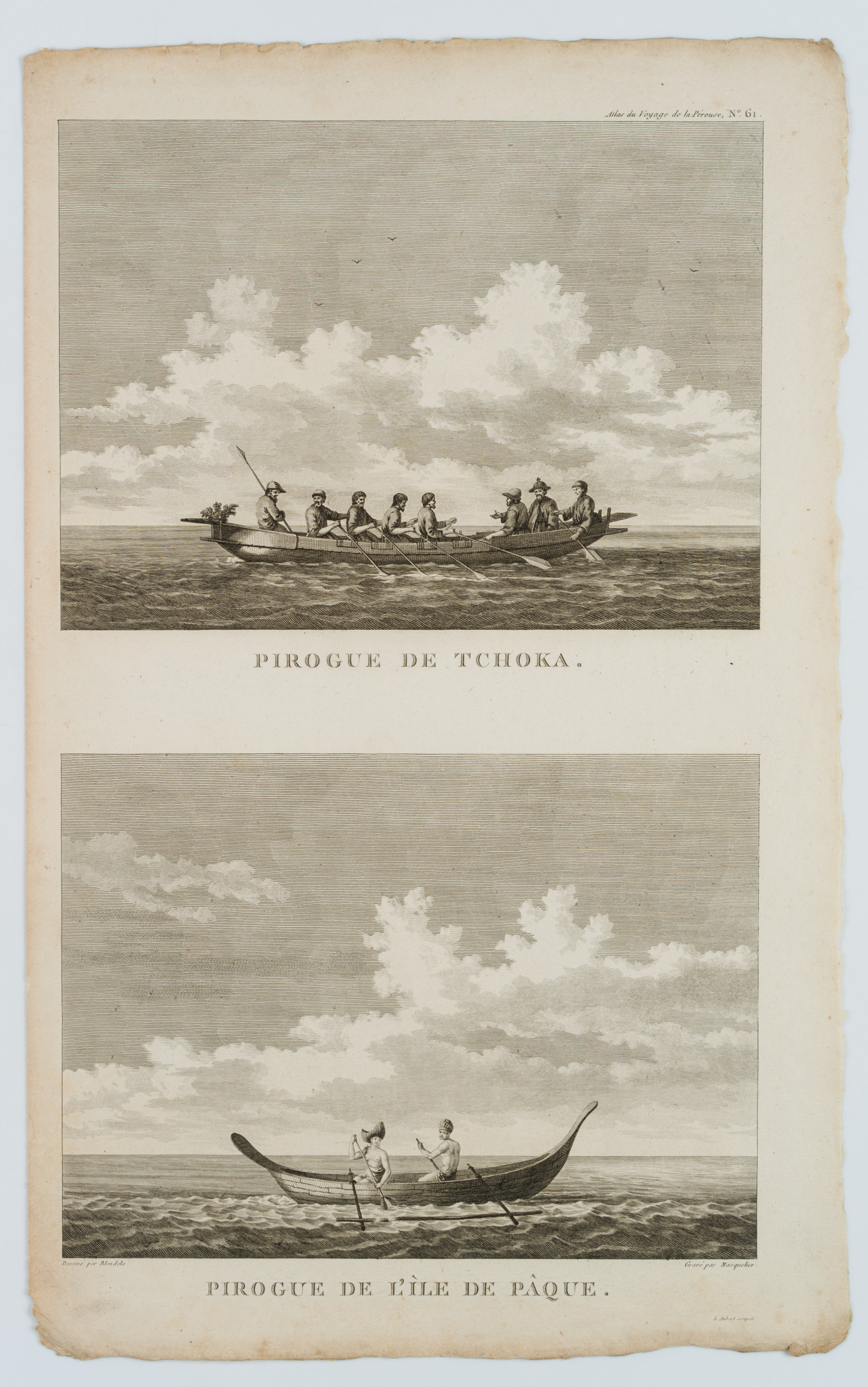 - Bezeichnung: Unten im Druck signiert: “Dessiné par Blondela | Gravé par Masquelier”. Im Druck bezeichnet: “Pirouge de Tchoka. / Pirogue de L’Île de Pâque. / L. Aubert scripsit”. Oben rechts im Druck nummeriert: “Atlas du Voyage de la Pérouse No 61”.