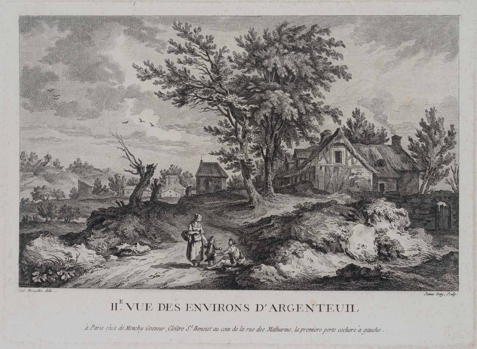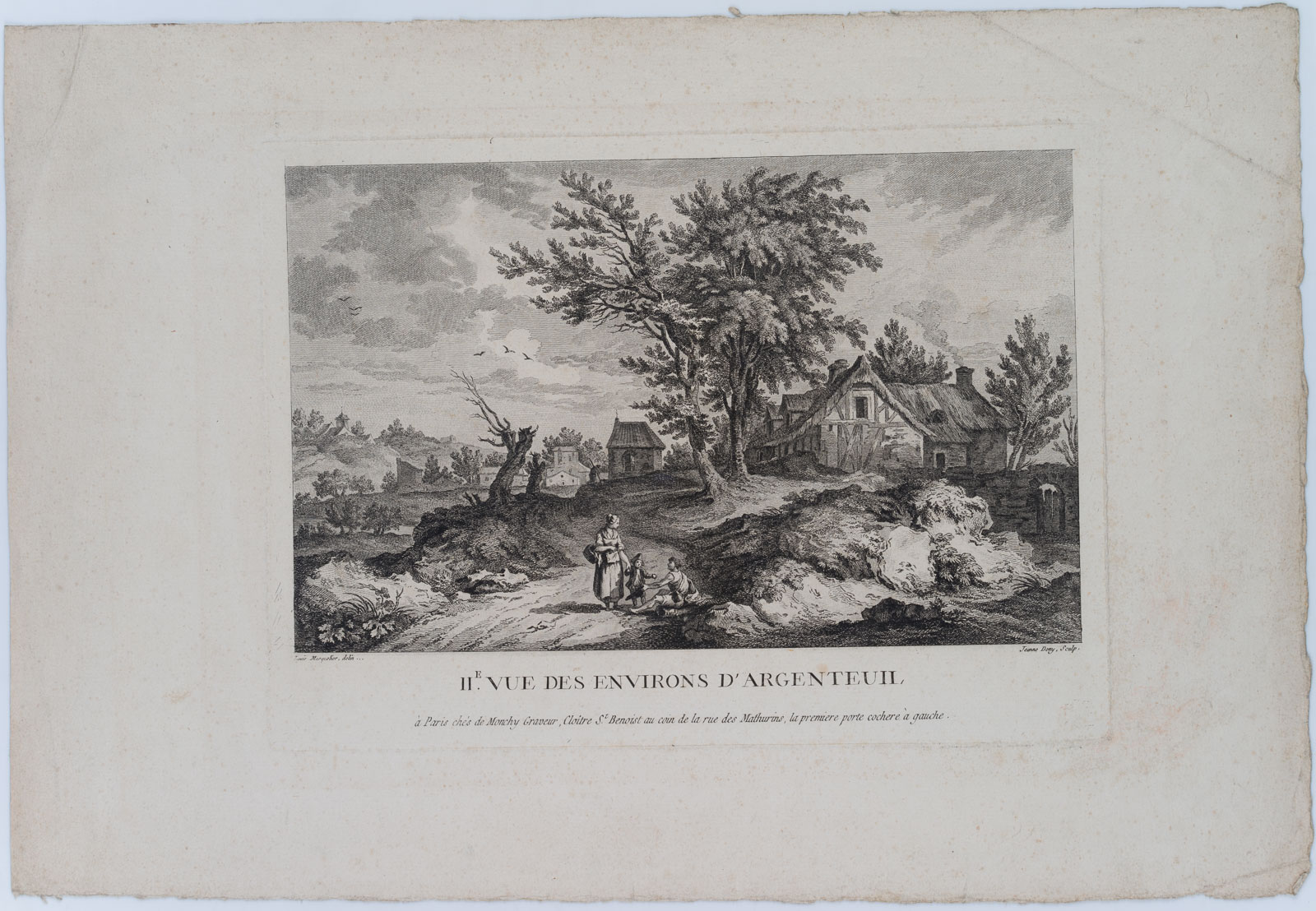 Louis Joseph Masquelier (1741 Cysoing – 1811 Paris) nach Jeann Deny (1749 Paris – nach 1815 ), Blick in eine Landschaft mit Gehöft, um 1800, Kupferstich