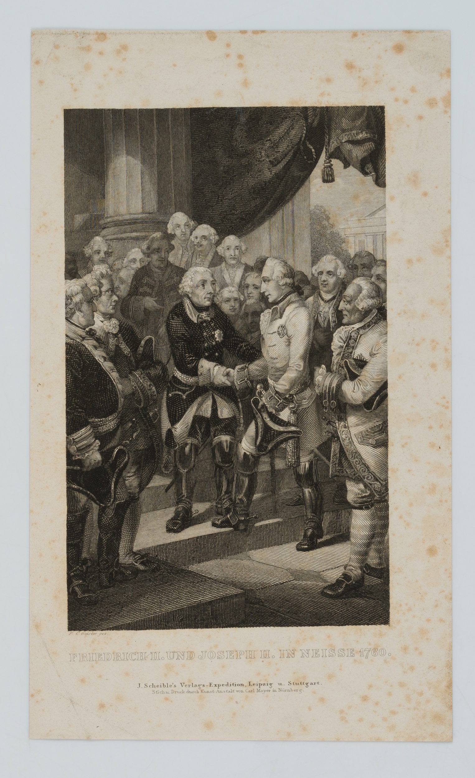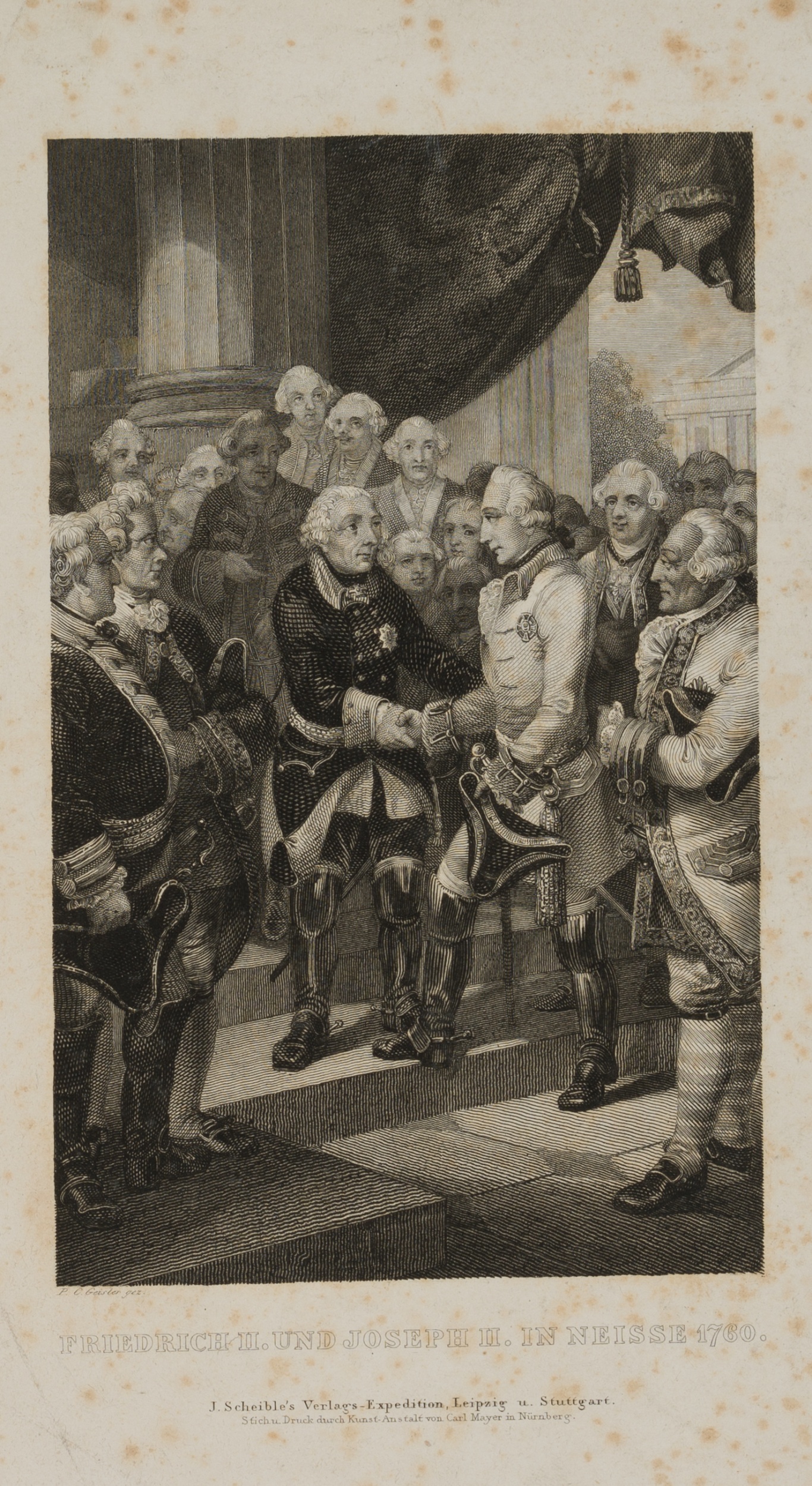 Carl Mayer (1798 Nürnberg – 1868 ebd.) nach Peter Carl Geissler (1802 Leipzig – 1872 Nürnberg), Friedrich II u. Joseph II. in Neiße 1760, um 1850, Kupferstich