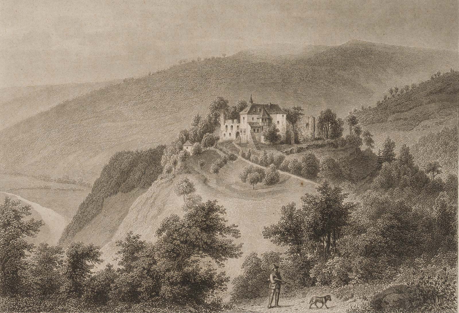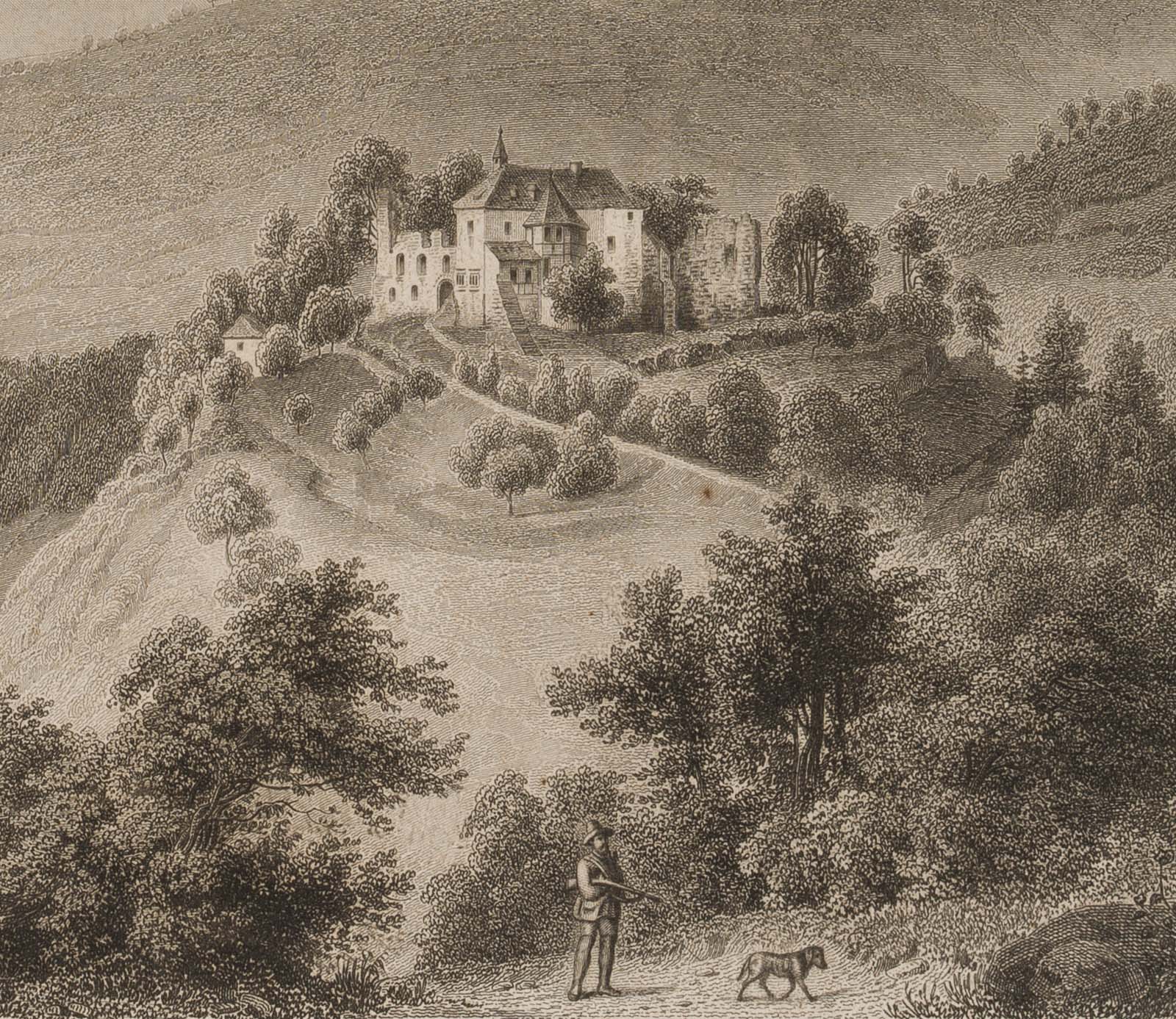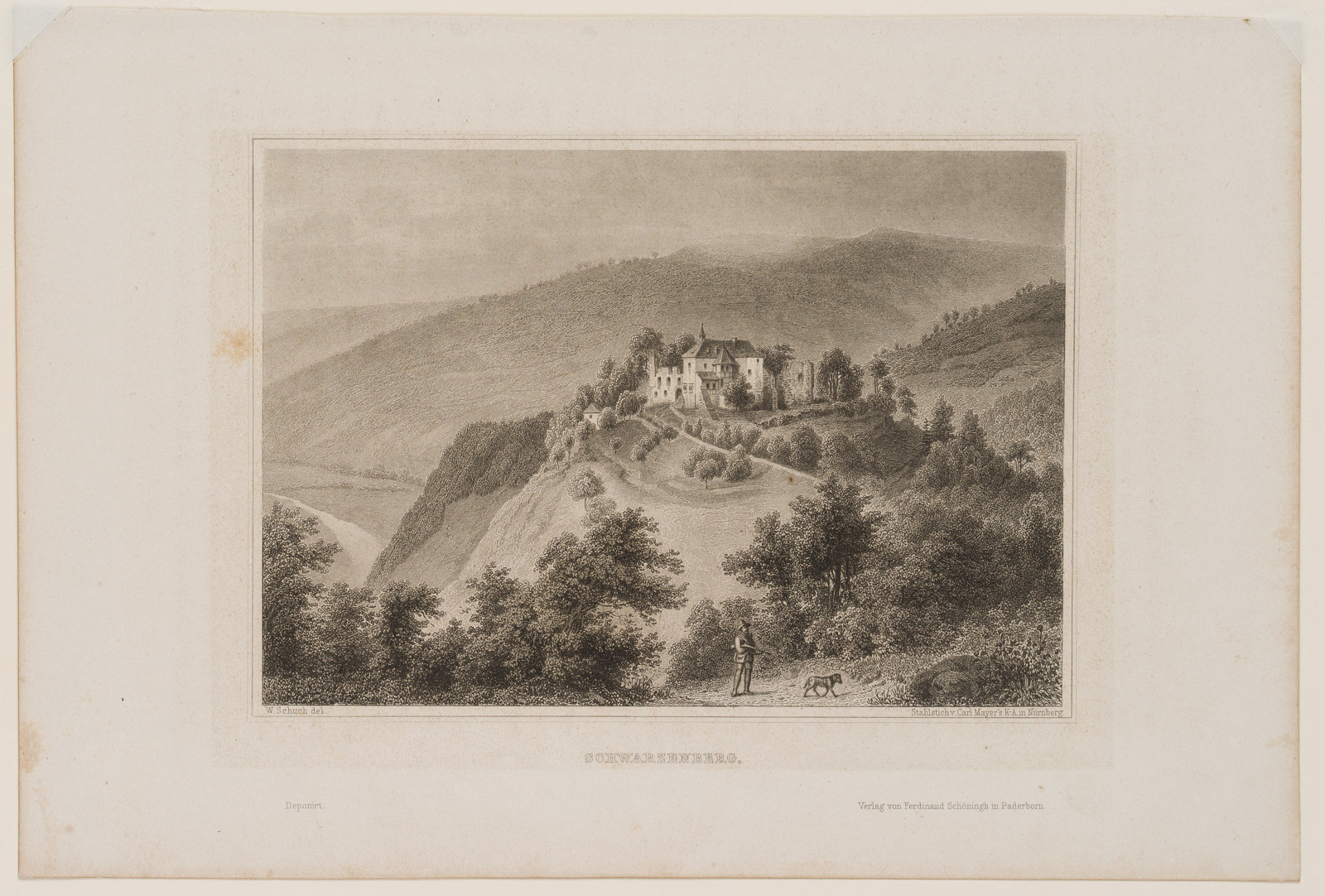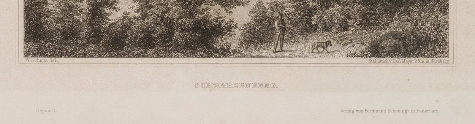 Carl Mayer (1798 Nuremberg – 1868 ibid.) after Werner Wilhelm Schuch (1843 Hildesheim – 1918 Berlin), View of the medieval Schwarzenberg Castle, Saxony, from an elevated hill with a hunter in the foreground, 19th century, Steel engraving