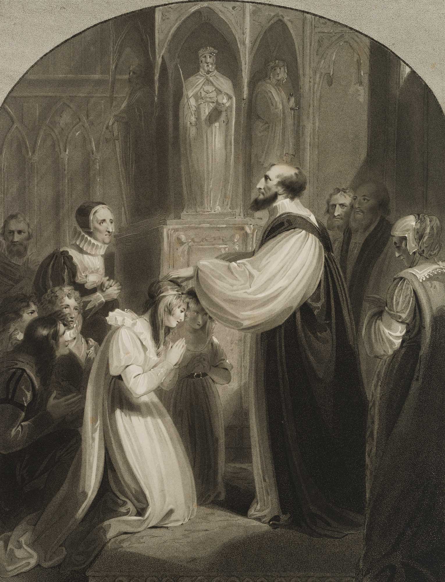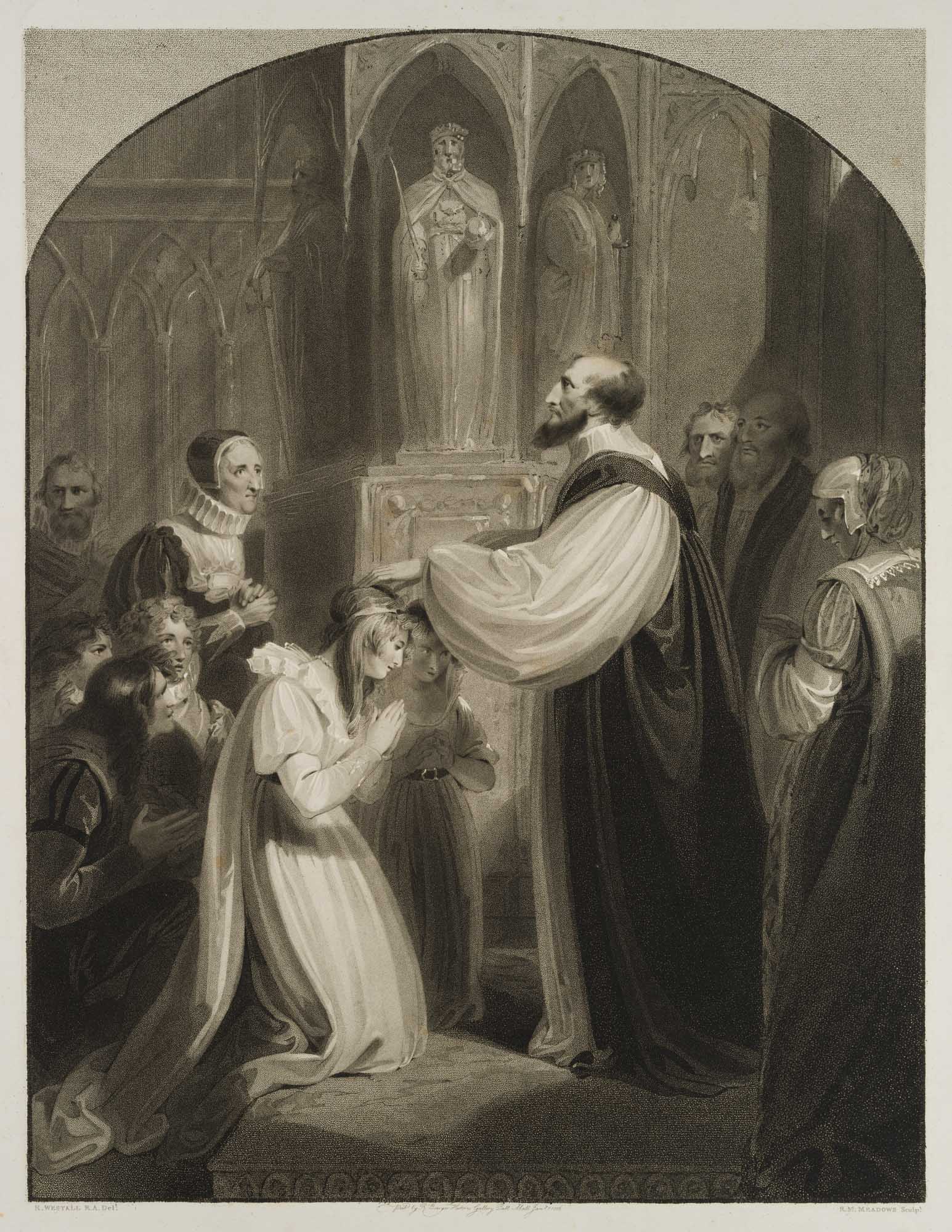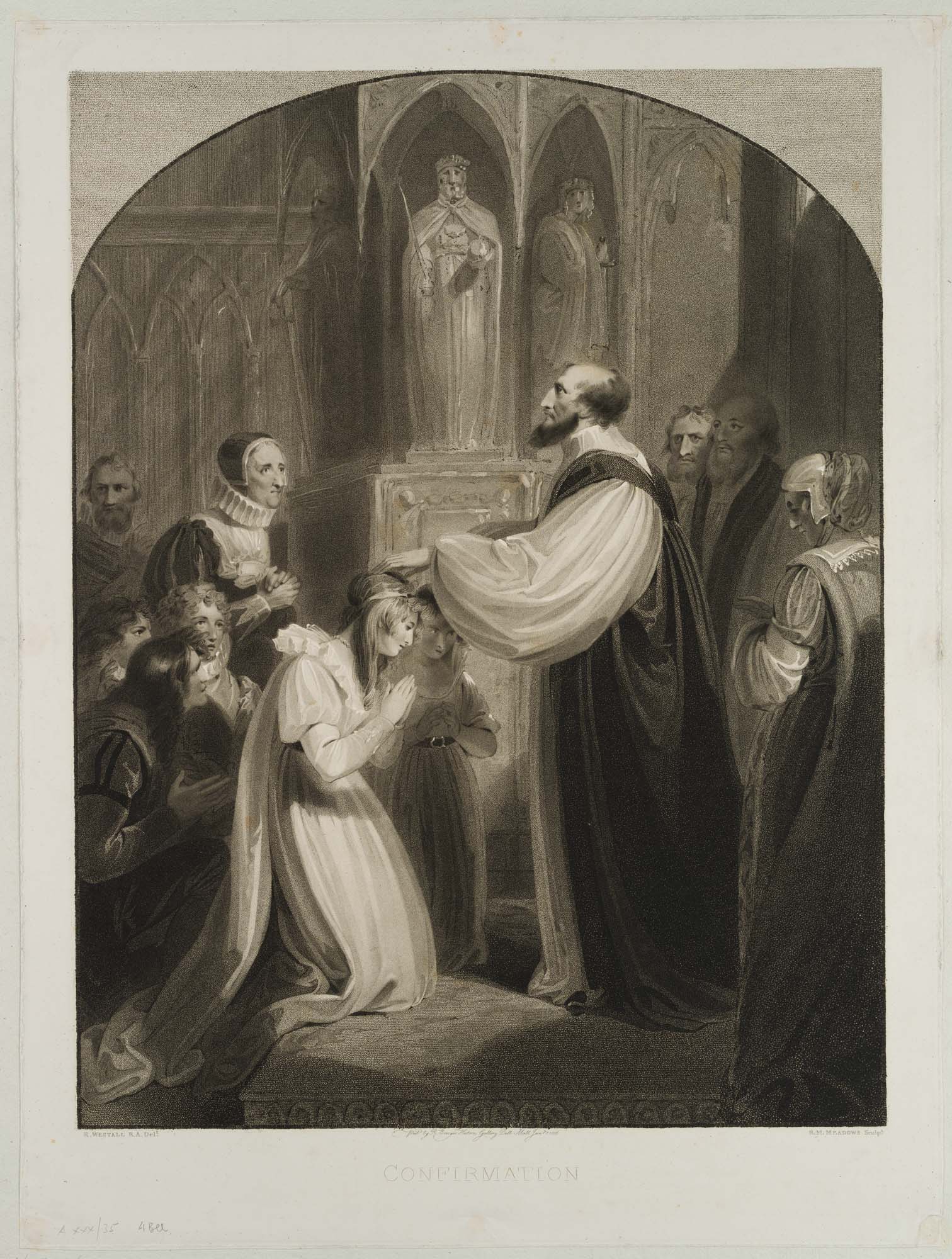 - Description: Sheet of excellent print quality. Signed, dated and inscribed below the image: “R. Westall R.A. Del. / Pub.d by R. Bowyer’s Historic Gallery Pall Mall Jan. in 1806 / R. M. Meadows sculp.t”. Titled typographically in centre below: “Confirmation”.