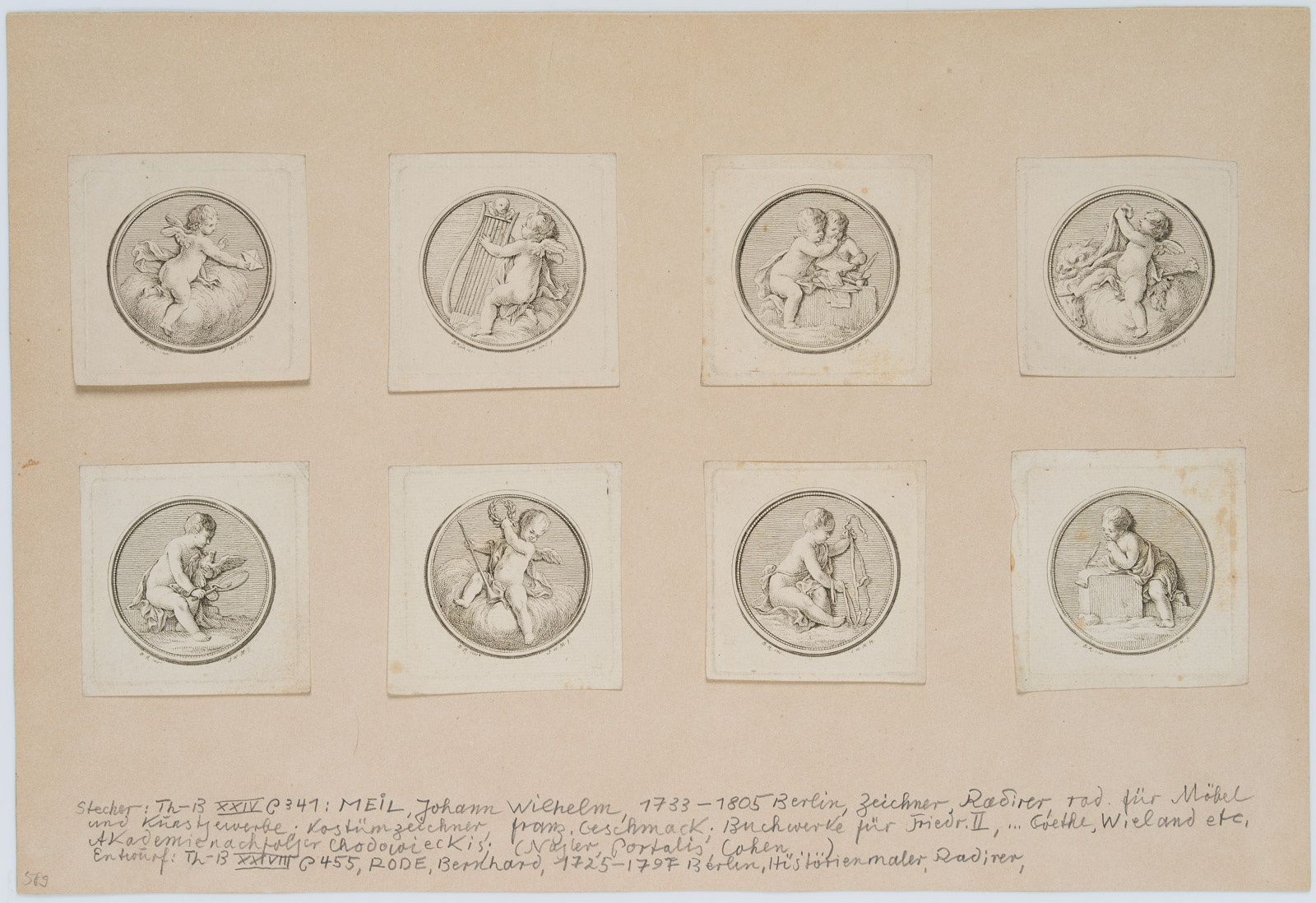 - Inscription: Inscribed at the bottom of the backing by another hand with life data and “Thieme-Becker vol. XXIV, p. 341: Meil…Radierer für Möbel und Kunstgewerbe, Kostümzeichner, französischer Geschmack; Buchwerke für Friedr. II, Goethe, Wieland etc., Akademienachfolger Chodowieckis.(Nagler, Portalis, Cohen)”.