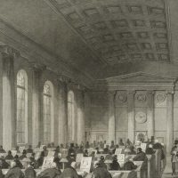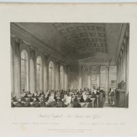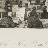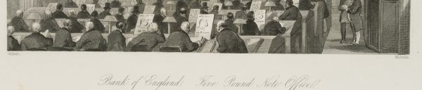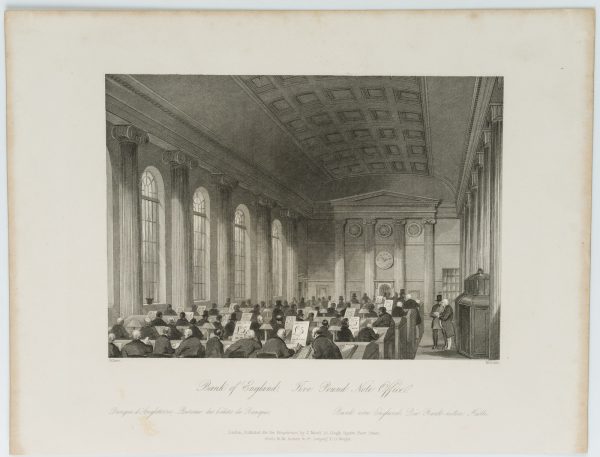 - Inscription: Signed on the left under the print: “Gilbert.” and on the right “Melville”. Below the caption in three languages: “Bank of England. Five Pound Note Office. | Banque d’Angleterre-Bureau des billets de Banque. | Bank of England. The Bank-notes Hall.”.