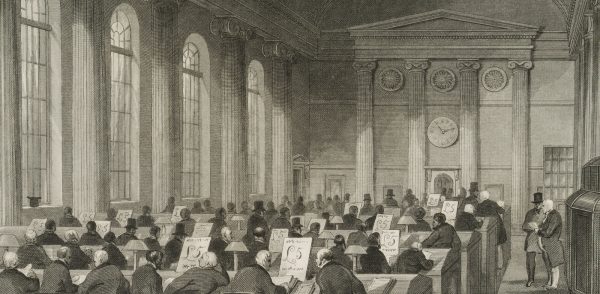 Henry Melville (1826 – 1877 ) nach Achille Isidore Gilbert (1828 Paris – 1899 ebd.), Bank of England. Five Pound Note Office, Interieur einer Bank, 1841-44, 1841, Stahlstich