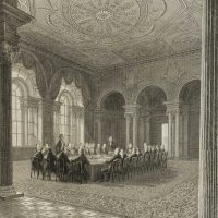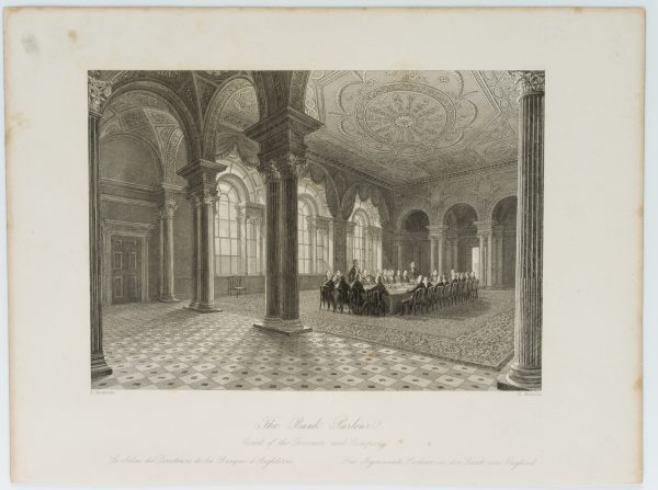 - Inscription: Signed on the left under the print: “F. Mackenzie” and on the right “H. Melville”. Below the caption in three languages: “The Bank Parlour. Court of the Govenor and Company. | Le Salon des Directeurs de la Banque d’Angleterre. | The so-called Parlour in the Bank of England.”.