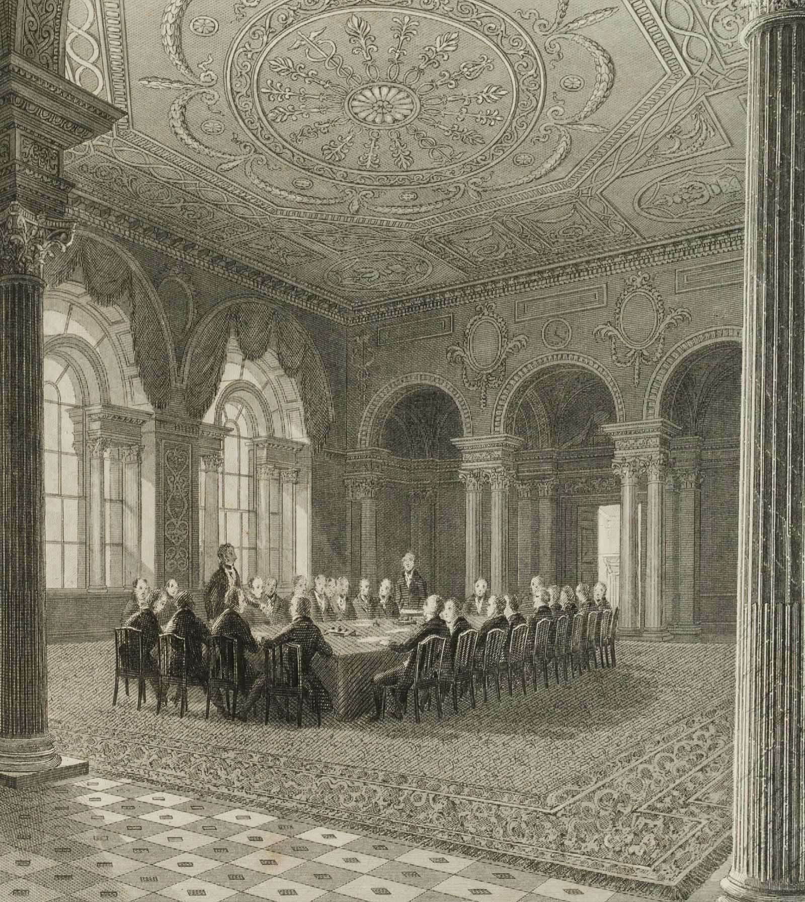 - Beschreibung: Interieurblick in das Parlour der Bank von England mit Herren um einen Tisch.