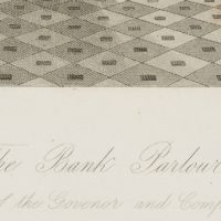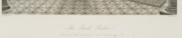 - Bezeichnung: Links unter der Graphik signiert mit: “F. Mackenzie” und rechts mit “H. Melville”. Darunter die Bildunterschrift in drei Sprachen: “The Bank Parlour. Court of the Govenor and Company. | Le Salon des Directeurs de la Banque d’Angleterre. | Das sogenannte Parlour in der Bank von England.”.