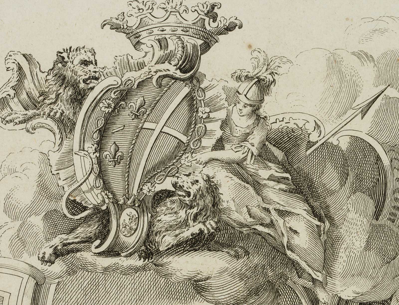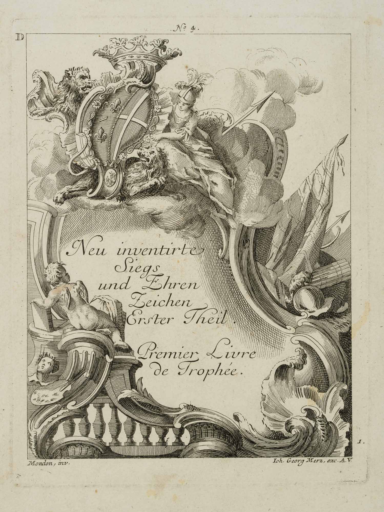 - Description: Artfully executed and decorative title page of set B “Livre de Trophée”, centrally titled: “Neu inventirte Siegs und Ehren Zeichen Erster Theil / Premier Livre de Trophée. Imaginatively decorated; with crown, two lions and coat of arms. The dominant stylistic feature here is the decorative form that gave the Rococo its name as a late Baroque style: the rocaille. It was created in France during the reign of King Louis XV from about 1730.