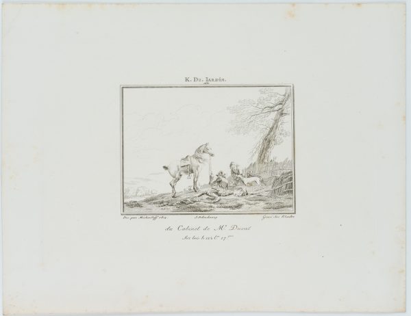 - Bezeichnung: Unterhalb der Darstellung typographisch betitelt, bezeichnet und datiert: „Des. par Michailoff 1812. / S. Petersbourg / Gravé chez Klauber. / du Cabinet de Mr. Duval / Sur bois…“. Über der Darstellung bezeichnet: „K. Du. JARDIN. 1661“.