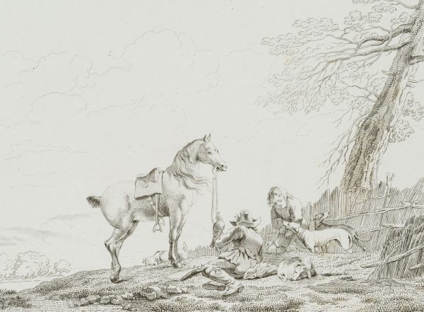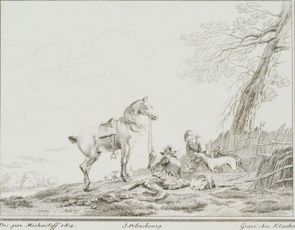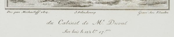 - Inscription: Typographically titled, inscribed and dated below the depiction: „Des. par Michailoff 1812. / S. Petersbourg / Gravé chez Klauber. / du Cabinet de Mr. Duval / Sur bois…“. Inscribed above the image: „K. Du. JARDIN. 1661“.