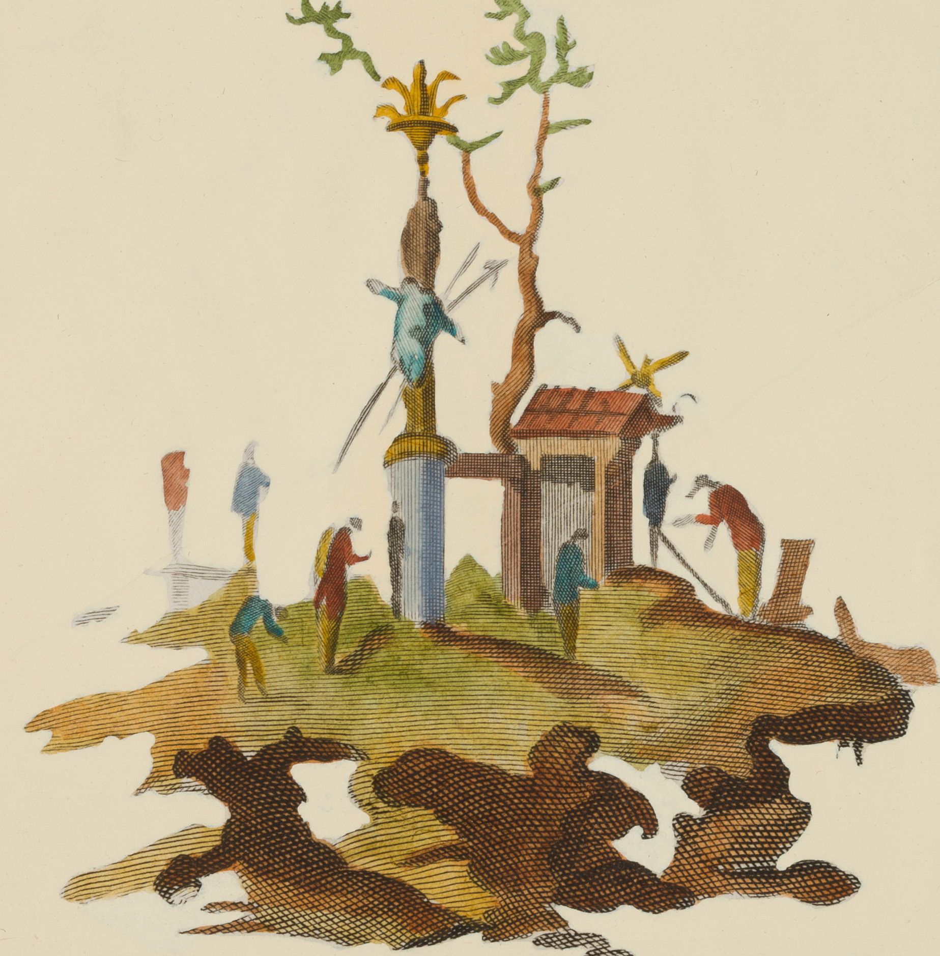 Monogrammist CM (18. Jahrhundert) nach Monogrammist CP (18. Jahrhundert), Fragmentierte Landschaft mit Figuren, Architekturelementen und schmaler Baum in der Mitte, , Kupferstich