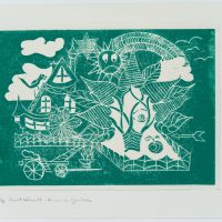- Beschreibung: Der grüne Linolschnitt zeigt eine phantasievolle Haus mit Gartenlandschaft. Die vereinfacht dargestellten Objekte tragen einen naiven als auch rätselhaften Charakter. Ein überdimensional großer Vogel sitzt auf dem Dach des kleinen Hauses, aus einer phantastischen Pflanze im Vorgarten wachsen riesige Blätter und am Himmerl weint die Sonne.