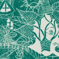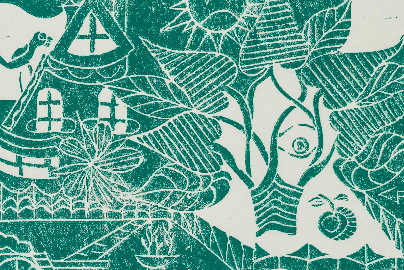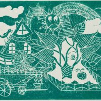 - Description: The green linocut shows an imaginative house with garden landscape. The simplified objects have a naïve as well as enigmatic character. An oversized bird sits on the roof of the small house, huge leaves grow from a fantastic plant in the front garden and the sun weeps in the sky.