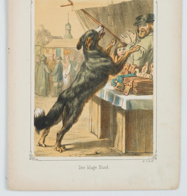 Monogrammist HZB (20th century), HZB, The Clever Dog Bernese Mountain Dog at the Sales Stall, 1900, 1900, Lithography