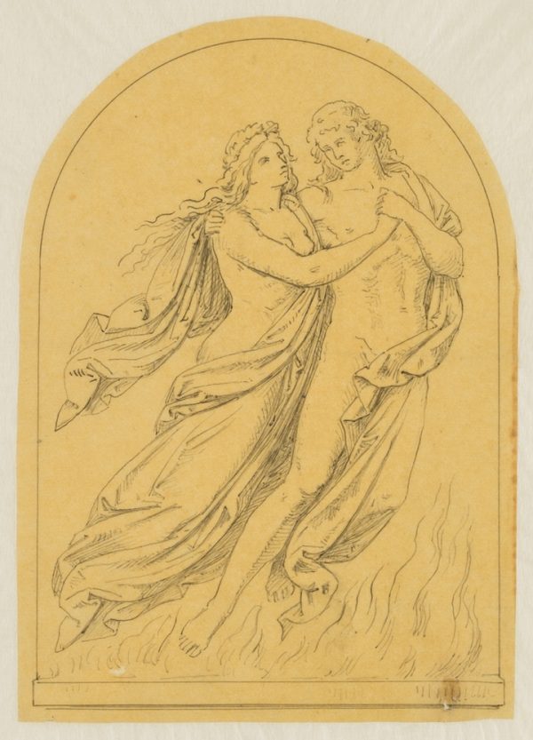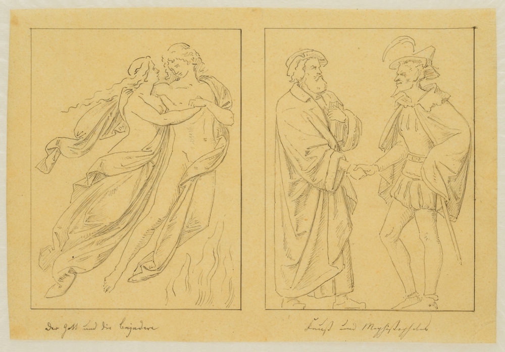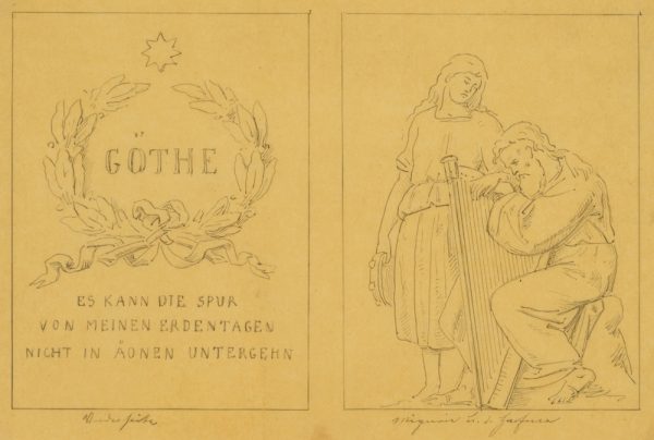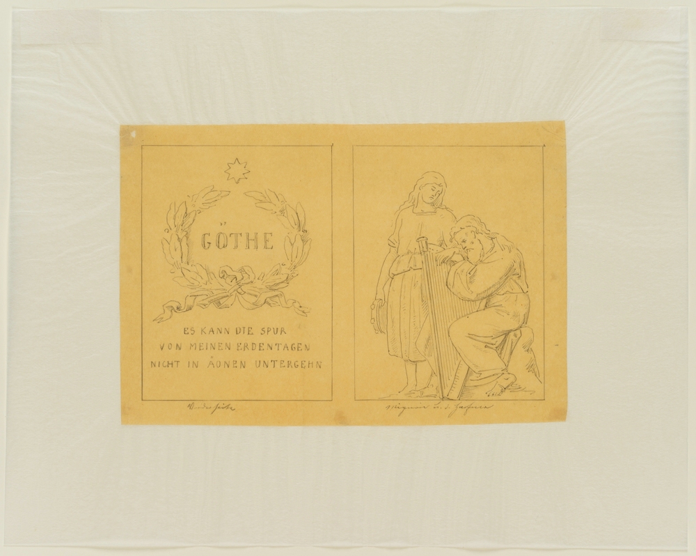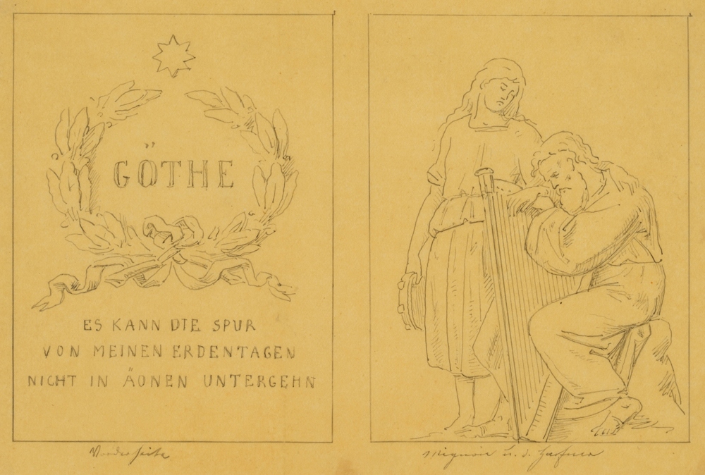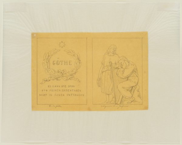 - Description: A series of three design drawings made on the occasion of the competition for the erection of a monument to the poet of Weimar Classicism Johann Wolfgang von Goethe in Berlin. The depictions show an inscription with a quotation from Goethe’s Faust: “The trace of my days on earth cannot perish in eons” as well as three figure fields with characters from Goethe’s works. On display are Mignon from Wilhelm Meisters Lehrjahre, The God and the Bayadere as well as Heinrich Faust and Mephistopheles. To The God and the Bayadere is enclosed a more finely executed drawing of the arch field at the planned pedestal.