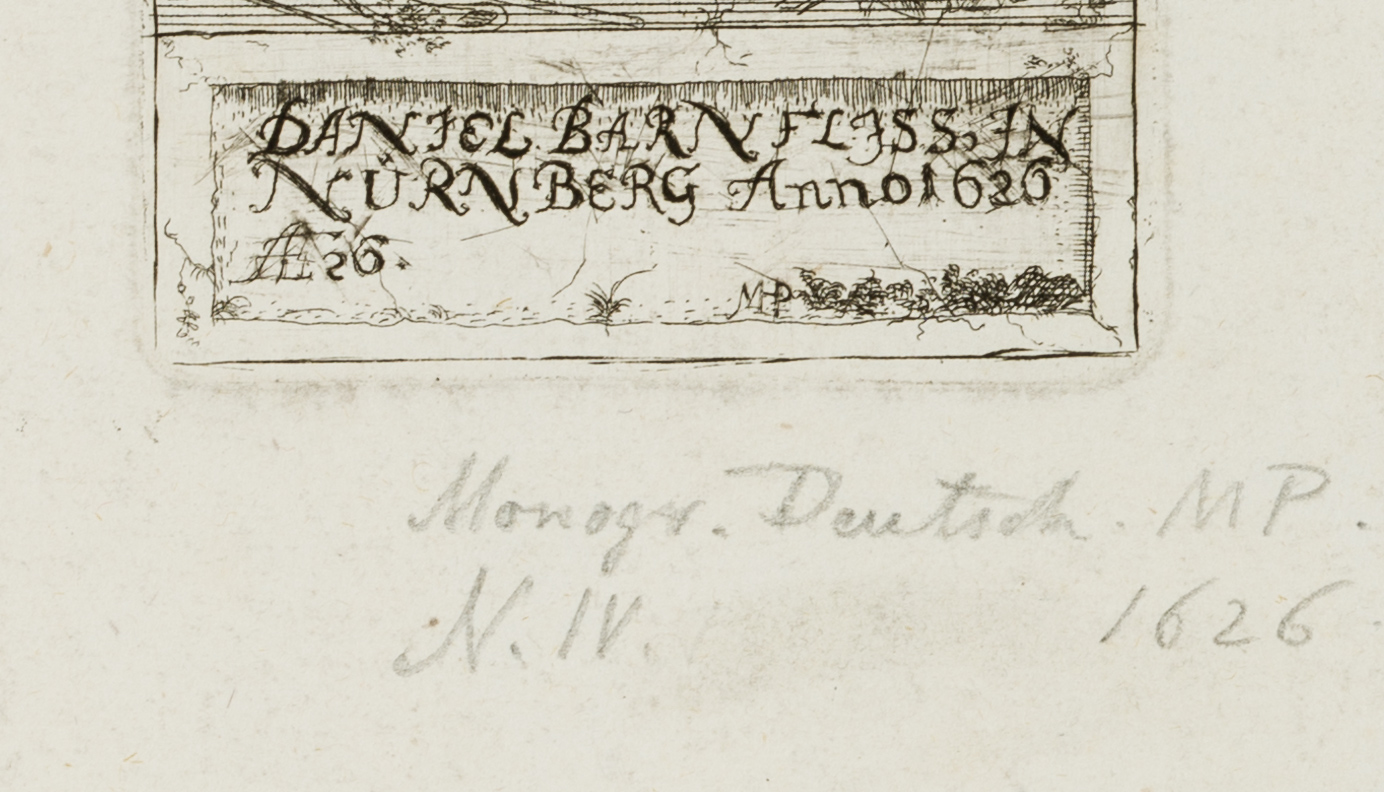 - Bezeichnung: Unterhalb beschriftet mit dem Namen und Daten des Dargestellten: DANIEL BARNFLISS IN NURNBERG Annoi 1626″. Darunter monogrammiert mit “MP”.