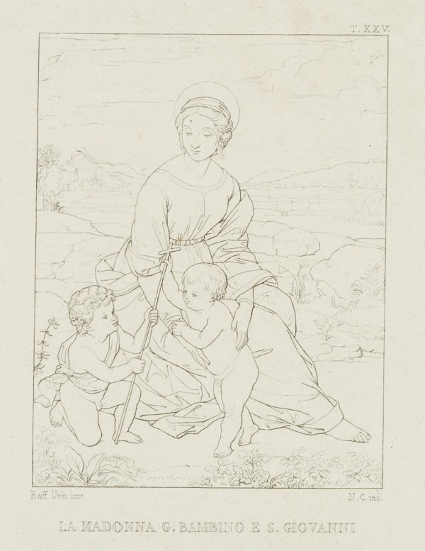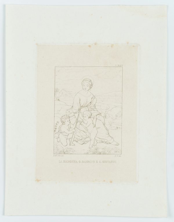 - Bezeichnung: Unten monogrammiert und betitelt: “La Madonna G. Bambino e S. Giovanni”.