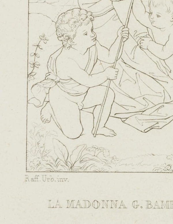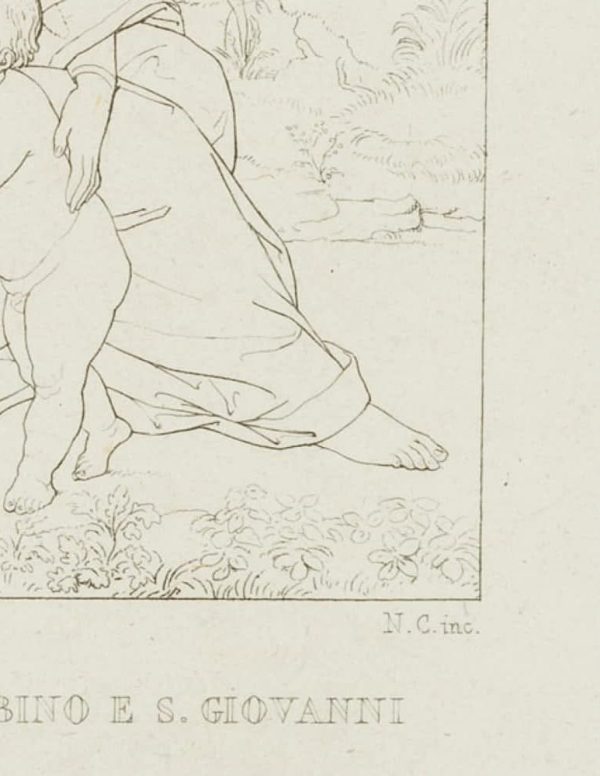 - Inscription: Monogrammed and titled at the bottom: “La Madonna G. Bambino e S. Giovanni”.