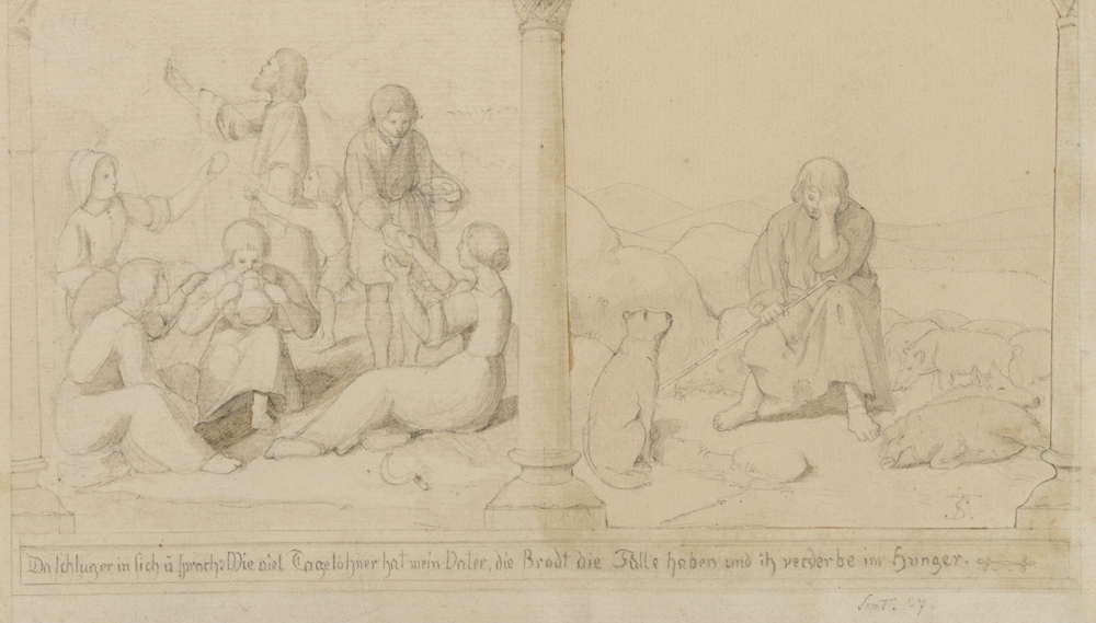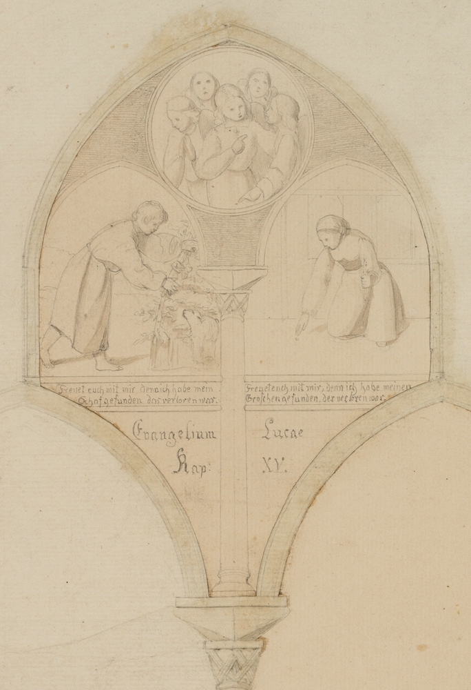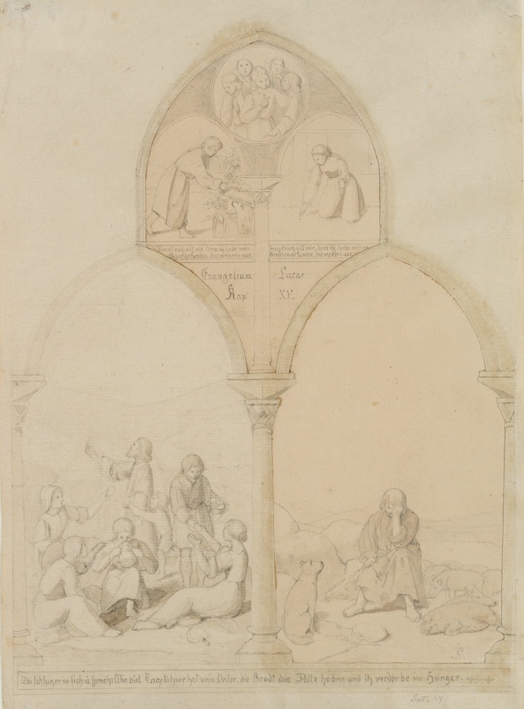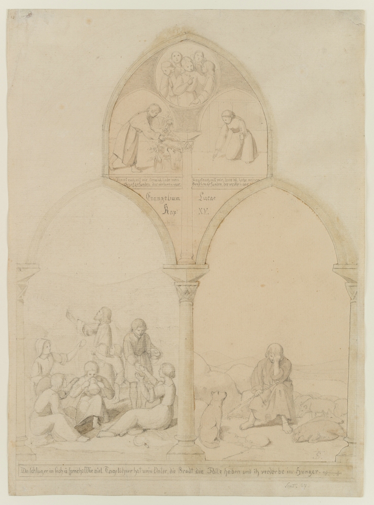 Die obere und rechte Bildtafel ist dem Hauptblatt jeweils hinterklebt. Aufwendige Entwurfsarbeit eines unbekannten Künstlers aus dem Umkreis der deutschen Nazarener um Julius Schnorr von Carolsfeld (1794-1872). In einer fingierten Architektur mit drei spitzbogigen Bildöffnungen sind biblische Figurenszenen zu sehen, die das Kapitel des Evangelisten Lukas zum Verlorenen Sohn illustrieren. Die obere Darstellung zeigt die vorangestellten Gleichnisse Lukas 15, 1-10 mit Auszügen des Bibeltextes. Die unteren stellen Szenen aus dem Gleichnis vom verlorenen Sohn dar, Lukas 15, 11-32. links ist eine Gruppe heiterer Personen beim Mahle gezeigt, rechts sitz der einsame Schweinehirte inmitten seiner Herde und empfindet schamvolle Reue. Vermutlich diente das Blatt als Entwurf für eine Buchillustration, ein Wandgemälde oder ein Tafelbild in einem religiösen Kontext.