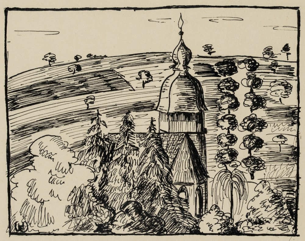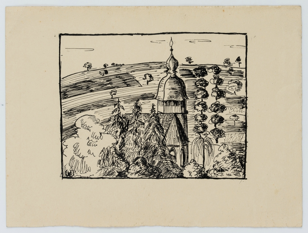 - Beschreibung: Einsame Kapelle mit schlichtem Zwiebelturm, von einer Baumgruppe verdeckt und vor einer Hügellandschaft.