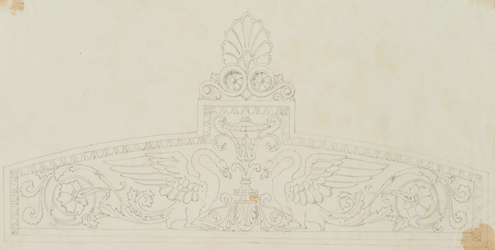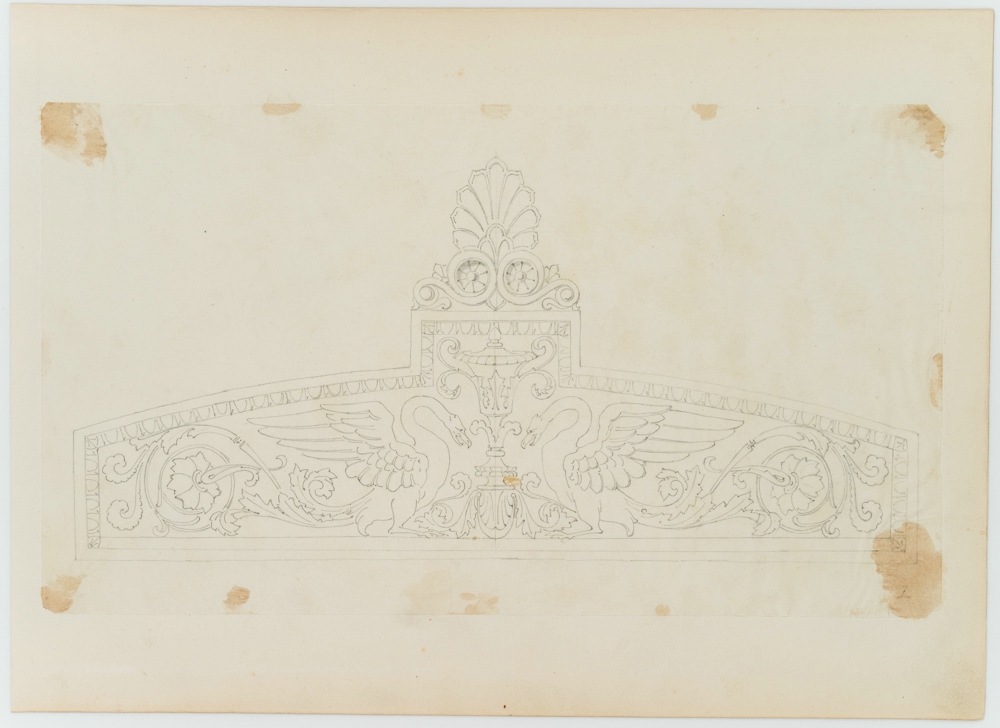 On the verso is a sheet with further drawings, these show classicist ornamental consoles with palmettes. Inscribed on the lower right with “Magdalenen-Gymn[asium]” and ligatured monogrammed with “ZH”. - Date: 19th century