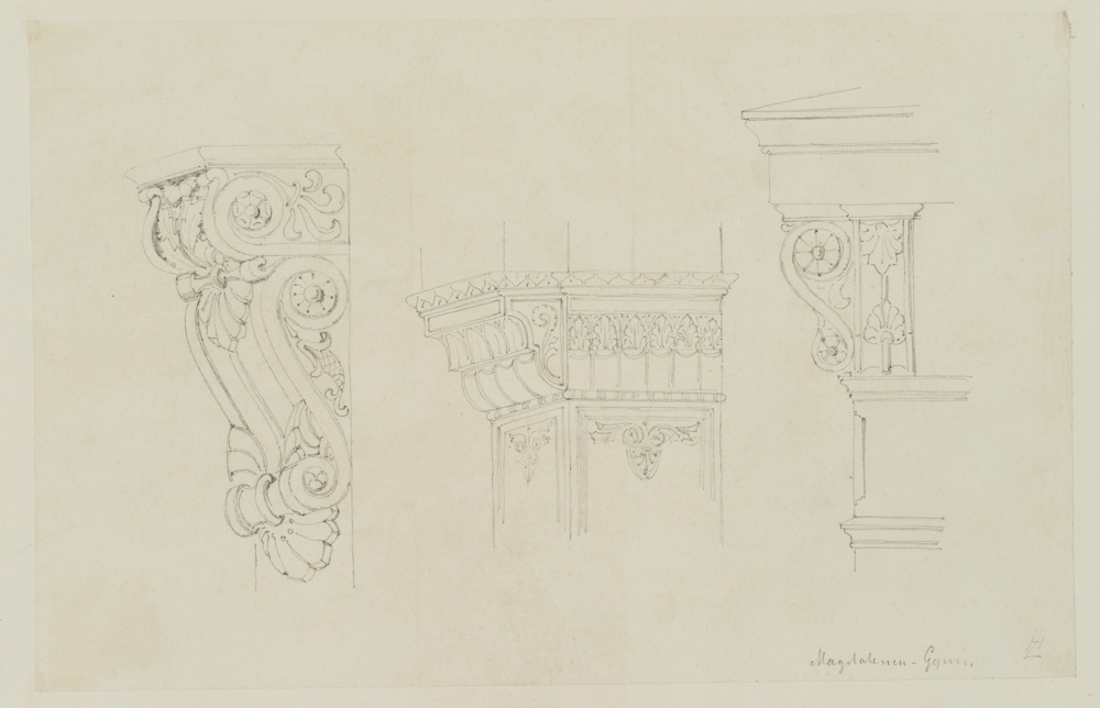 Verso befindet sich ein Blatt mit weiteren Zeichnungen, diese zeigen klassizistische Zierkonsolen mit Palmetten. Rechts unten bezeichnet mit “Magdalenen-Gymn[asium]” und ligiert monogrammiert mit “ZH”. - Datierung: 19. Jahrhundert