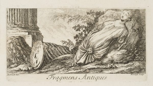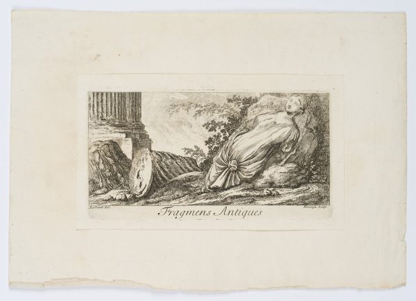 - Description: Unnumbered plate with architectural and sculptural fragments, with debris of a column shaft and a capital with acanthus leaves on a column base on the left and the torso of a female statue on the right. The engraving appears below the illustration “Vue du Restes du Temple de la Paix dans le Campo Vaccino” listed under “1 le Colisée” in “Les Plus Beaux Monuments de Rome Ancienne ou Recueil des plus beaux Morceaux de l’Antiquité Romaine qui existent encore” (Rome 1761).