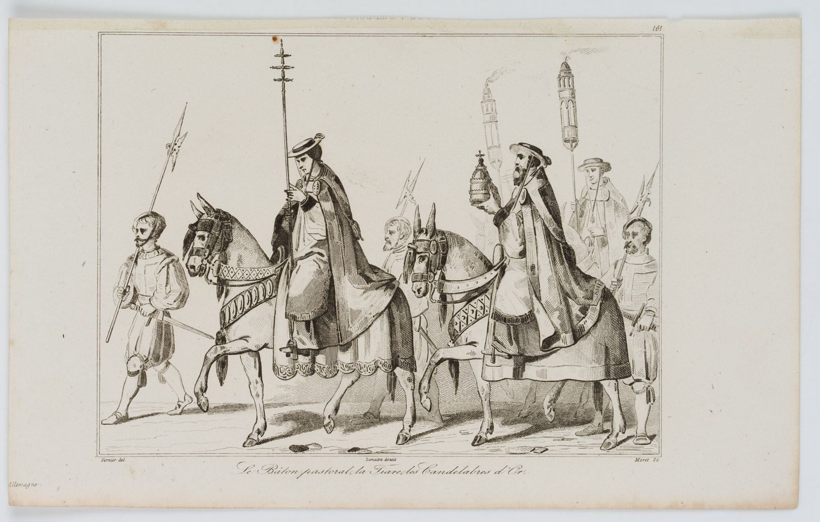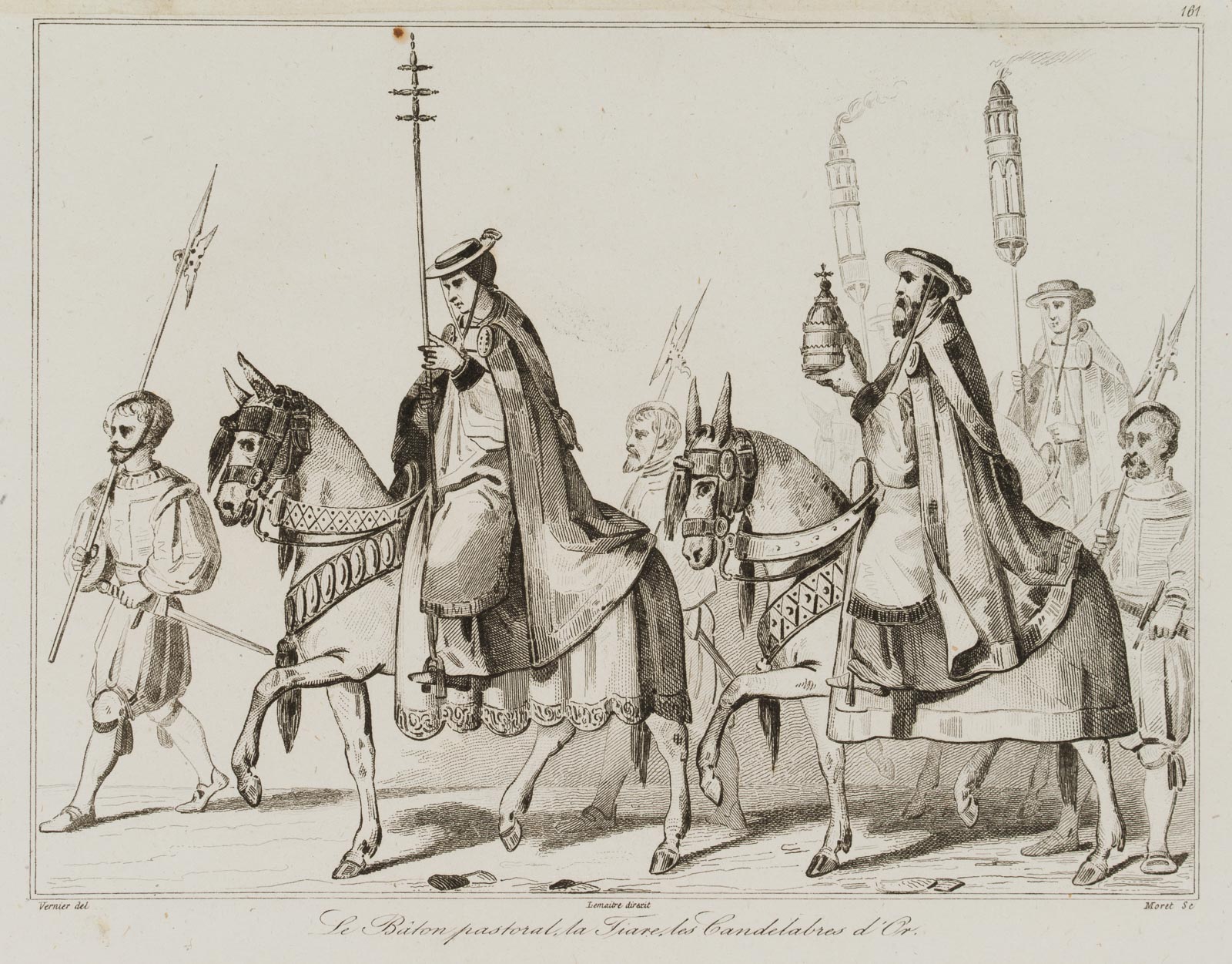 - Beschreibung: Unter der Darstellung bezeichnet “Le bâton pastoral, la tiare, les candélabres d’or”. Unter der Darstellung signiert “Vernier del. / Lemaitre direxit / Branche sc.”.