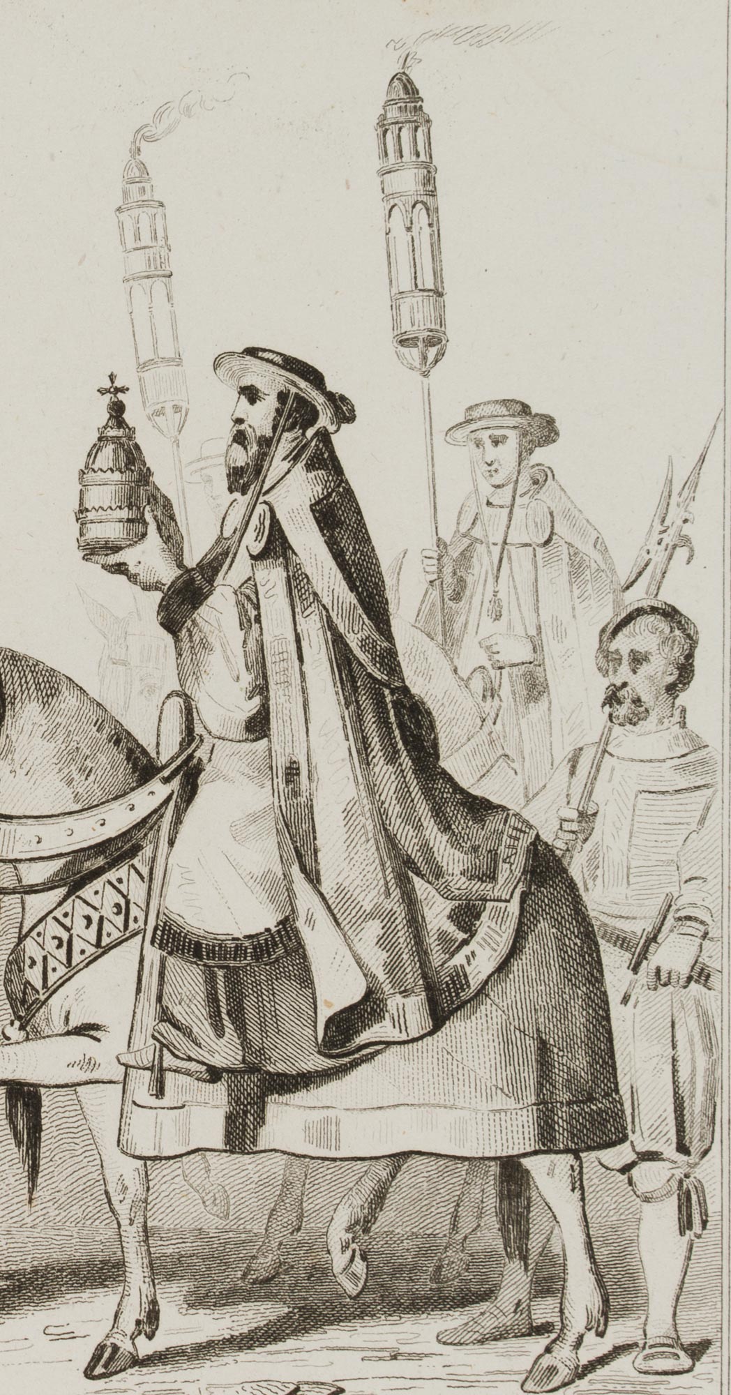 Moret (19th century) after Vernier (19th century), The pastoral staff, the tiara, the golden candelabra, 19th century, Copper engraving