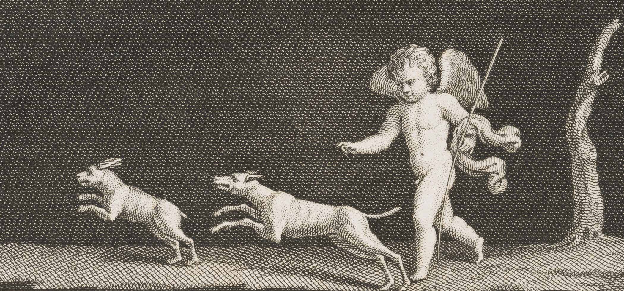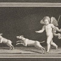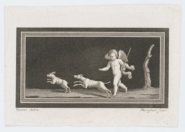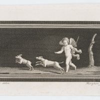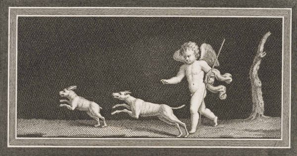 - Description: Putto in front of a dark background hunting with two dogs. In the background a bare tree stump. The print is from the publication ‘Antiquities of Herculaneum’ and shows wall frescoes found during excavations in Herculaneum around 1750.