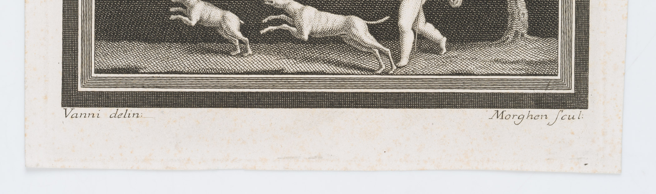 - Inscription: Lower middle signed in the printing plate: “Vanni delin: | Morghen Scul:”.